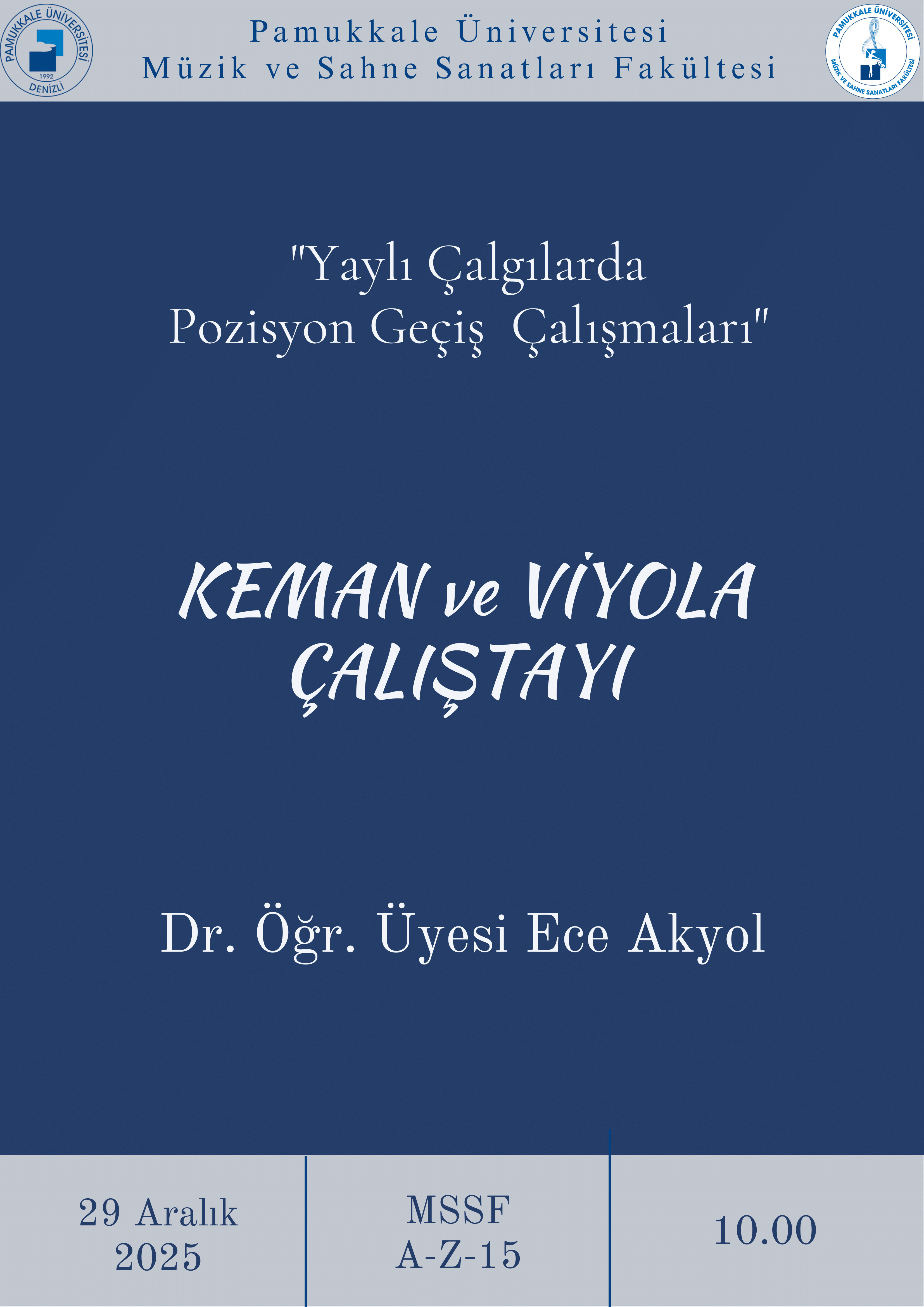 Keman ve Viyola Çalıştayı Çalıştay 29 Aralık 2025 Müzik ve Sahne Sanatları Fakültesi Sahne Alanlar: Dr. Öğr. Üyesi Ece AKYOL