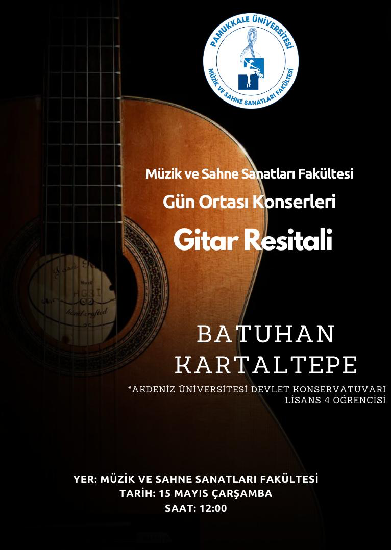 Gitar Resitali Konser 15 Mayıs 2024 Müzik ve Sahne Sanatları Fakültesi Sahne Alanlar: Öğr. Gör. Utku ÖZKANOĞLU; Batuhan KARTALTEPE Organizatör: Arş. Gör. Dr. Oğuz KALKAN