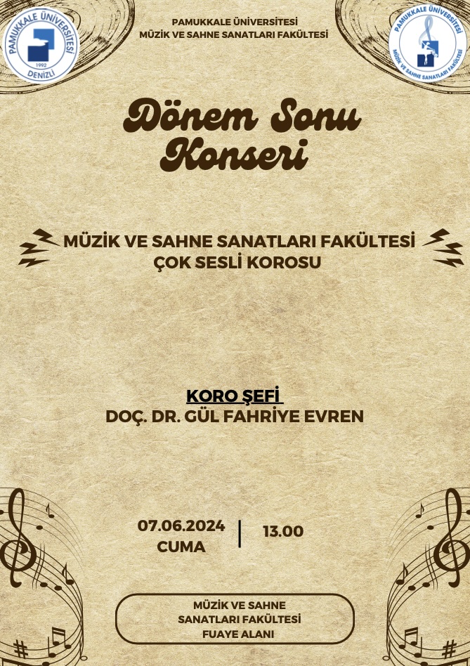 Müzik ve Sahne Sanatları Fakültesi Çok Sesli Korosu Dönem Sonu Konseri Konser 07 Haziran 2024 Müzik ve Sahne Sanatları Fakültesi Sahne Alanlar: Müzik ve Sahne Sanatları Fakültesi Çok Sesli Korosu Organizatör: Koro Şefi: Doç. Dr. Gül Fahriye EVREN