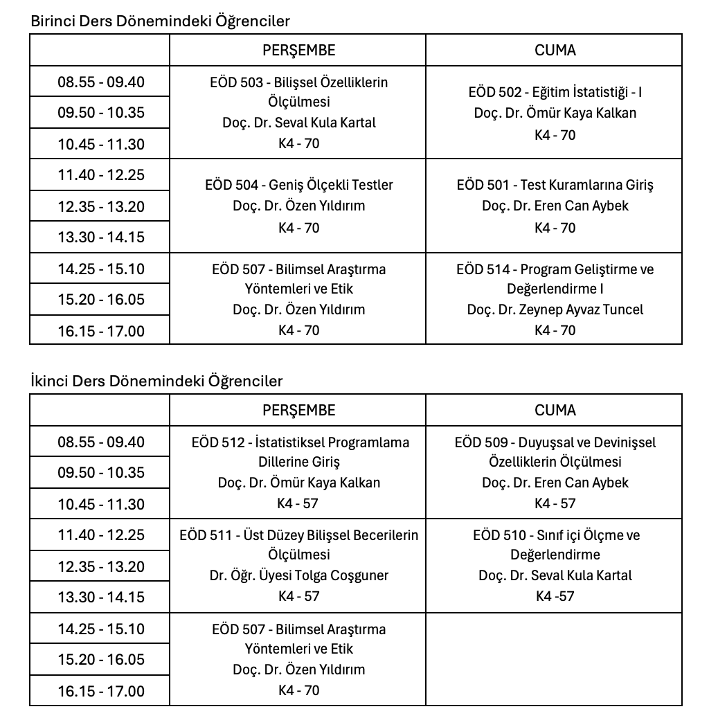 25-26 GÜZ DÖNEMİ YÜKSEK LİSANS DERS PROGRAMI Güncellenme Tarihi: 19 Eylül 2025 2025 - 2026 Güz Dönemi Eğitimde Ölçme ve Değerlendirme Tezli Yüksek Lisans Ders Programı yayımlanmıştır. Yeni dönemde başarılar dileriz..