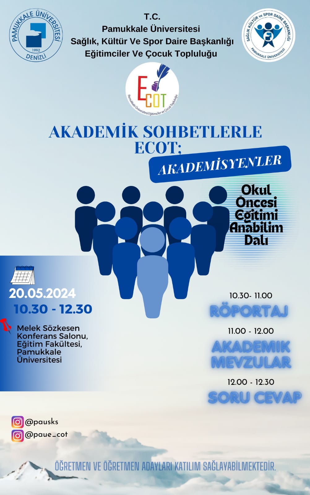 Akademik Sohbetlerle ECOT etkinliği, öğretmen ve öğretmen adaylarının akademik başarıya ulaşmalarına yardımcı olmak için düzenlenmektedir. Etkinlikte, akademik mevzuat hakkında bilgi verilecek ve soru-cevap oturumu düzenlenecek.