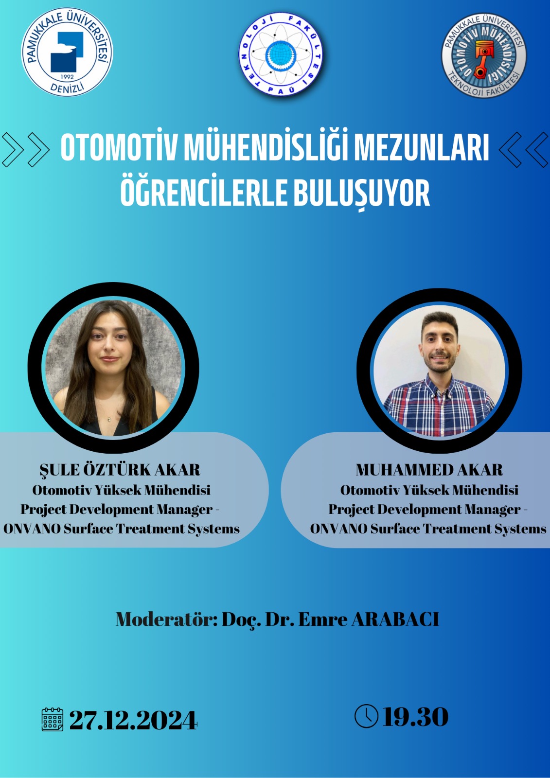 Otomotiv Mühendisliği Mezunları Öğrencilerle Buluşuyor Konferans 27 Aralık 2024 PAÜ Teknoloji Fakültesi Etkinlik Online olup katılım linki aşağıdadır. Etkinlik katılım linki: Otomotiv Mühendisliği Mezunları Öğrencilerle Buluşuyor