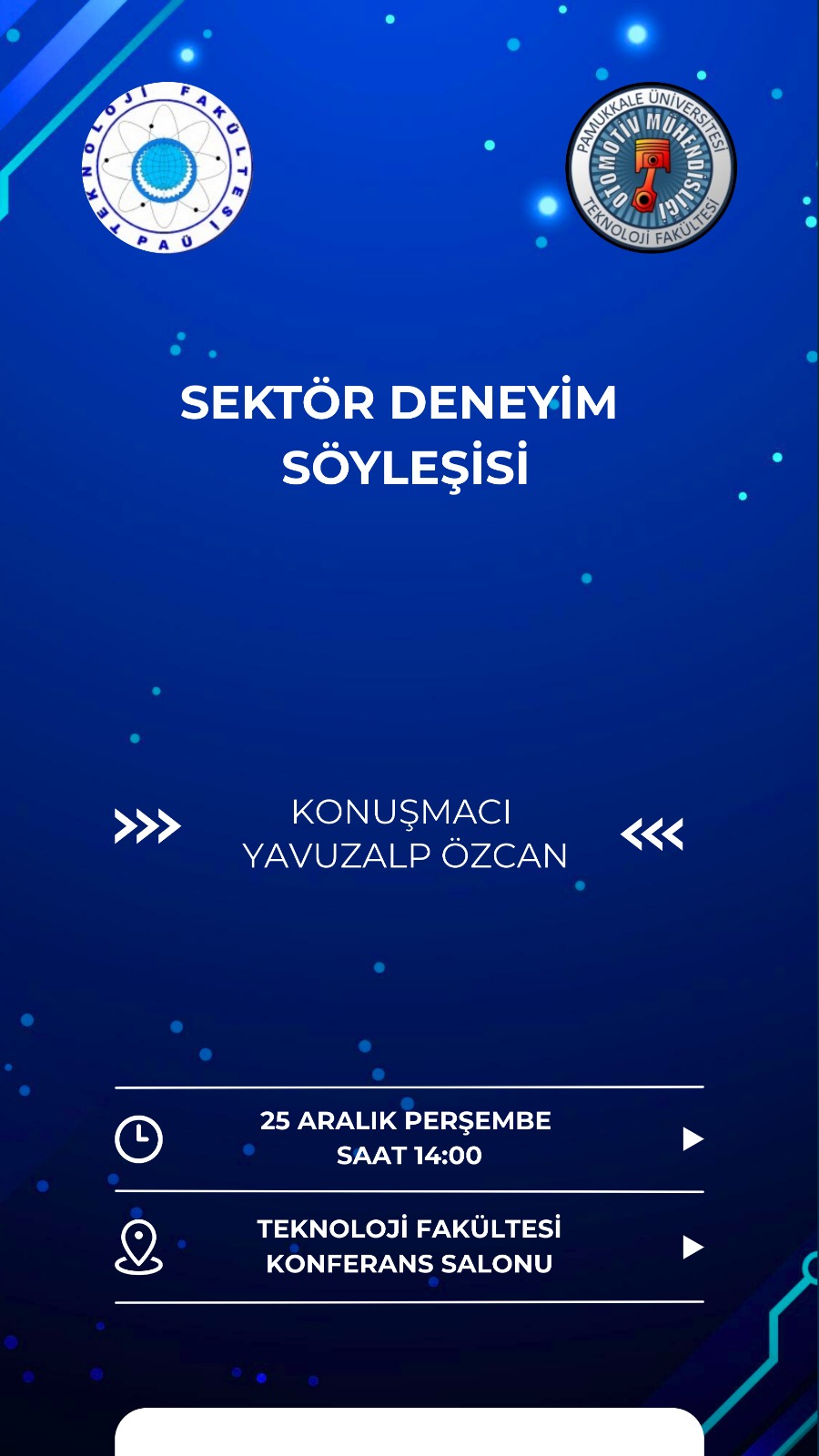 SEKTÖR DENEYİM SÖYLEŞİSİ Söyleşi 23 Aralık 2025 - 30 Aralık 2025 PAÜ Teknoloji Fakültesi Sahne Alanlar: YAVUZALP ÖZCAN