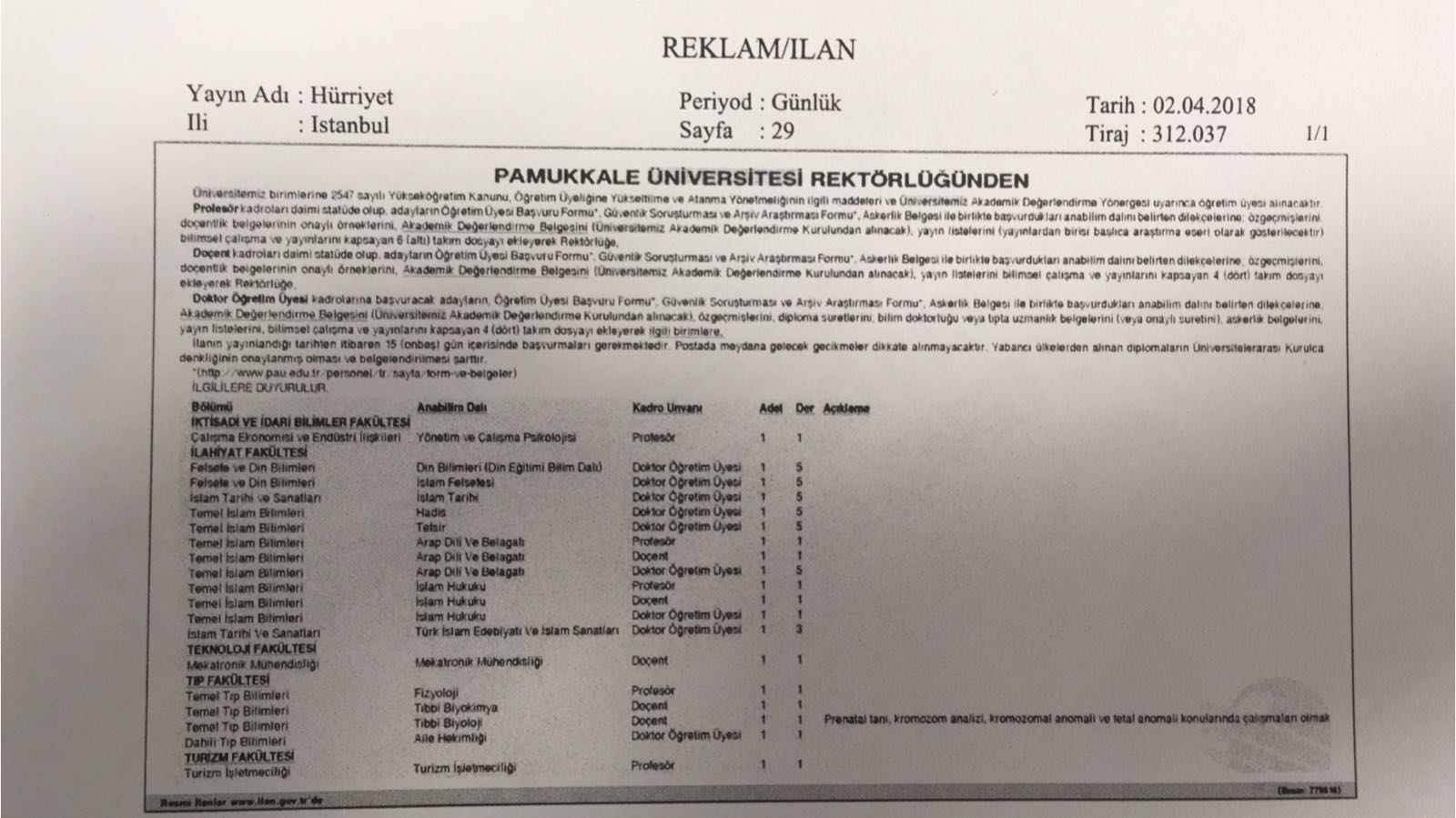Öğretim Üyesi İlanı Addition Date: 02 April 2018 Üniversitemiz öğretim üyesi alım ilanı 02.04.2018 tarihli Hürriyet Gazetesinde yayımlanmıştır.