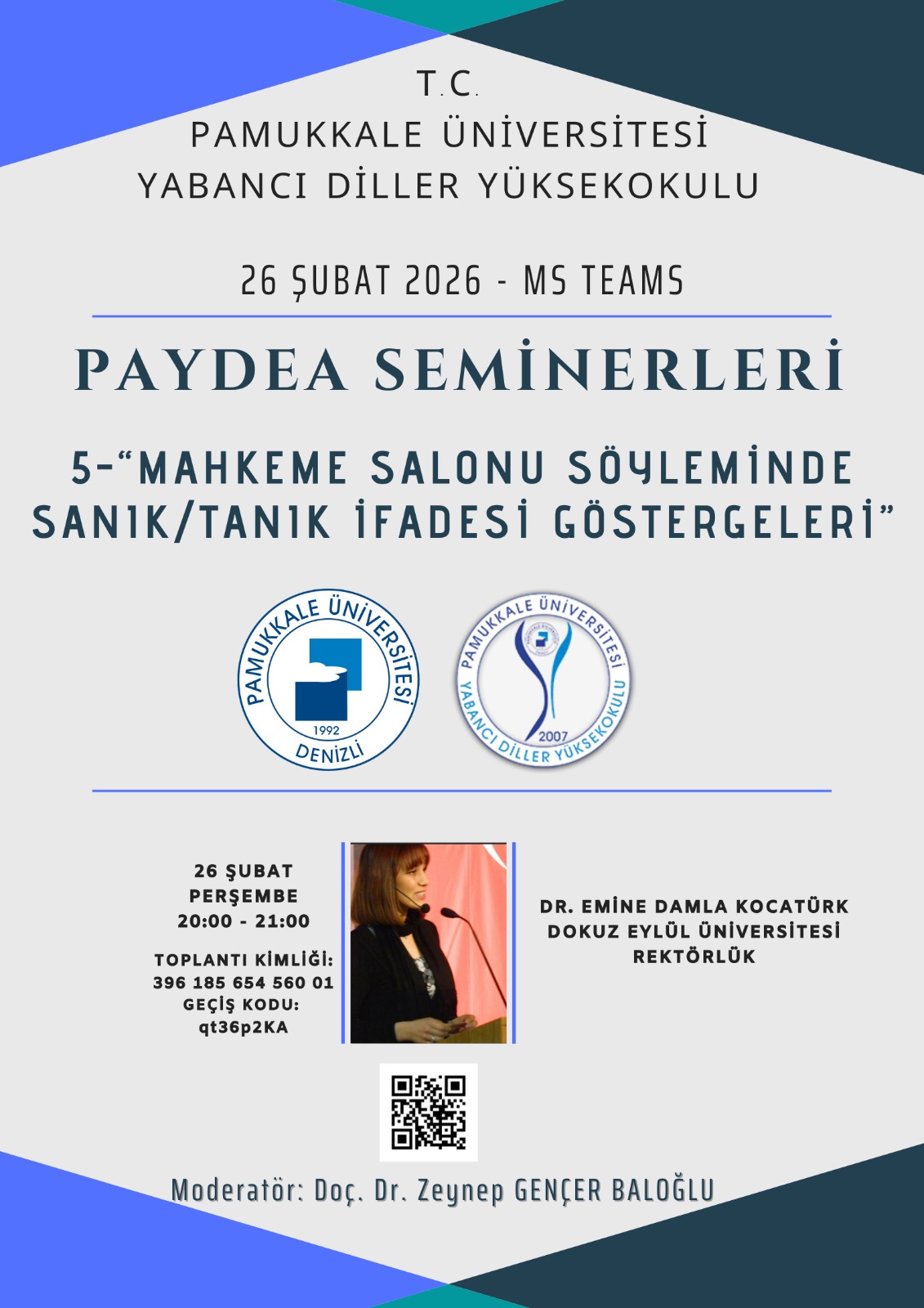 Yüksekokulumuz Akademik ve Sosyal Aktivite Koordinatörlüğünün 2025-2026 Eğitim Öğretim Yılında Microsoft Teams platformu üzerinden çevrim içi olarak düzenleyeceği PAYDEA seminerlerinin beşincisi olan "Mahkeme Salonu Söyleminde Sanık/Tanık İfadesi Göstergeleri" konulu seminer 26 Şubat 2026 Perşembe günü saat 20.00'de gerçekleştirilecektir. Seminer, Dokuz Eylül Üniversitesi öğretim elemanlarından Dr. Emine Damla KOCATÜRK tarafından verilecek olup tüm akademik personel ve öğrencilerimizin katılımına açıktır. Afişte bulunan QR kodunu okutarak veya erişim bağlantısını tıklayarak katılabilirsiniz.