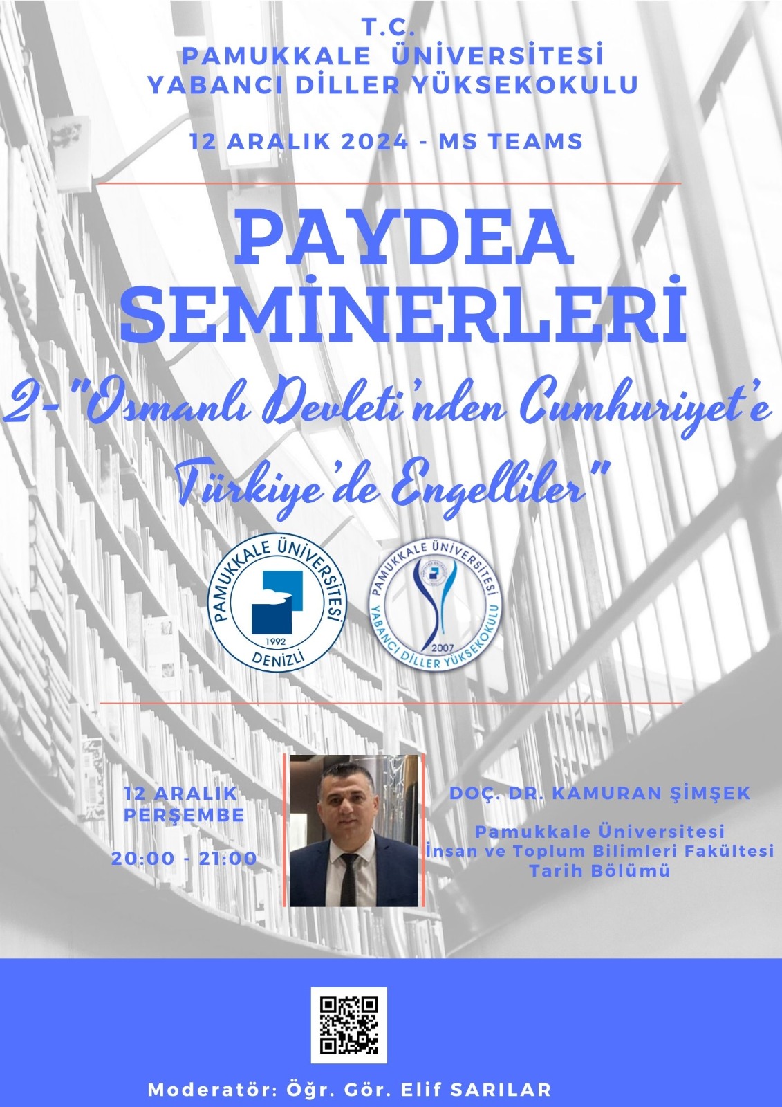 Yüksekokulumuz Yabancı Diller Bölümü-Akademik ve Sosyal Aktivite Koordinatörlüğünün 2024-2025 Eğitim Öğretim Yılında Microsoft Teams üzerinden düzenleyeceği Pamukkale Üniversitesi Yabancı Diller Yüksekokulu Dil ve Edebiyat Araştırmaları (PAYDEA) seminerlerinin ikinci olan "Osmanlı Devleti’nden Cumhuriyet’e Türkiye’de Engelliler” adlı semineri 12.12.2024 tarihinde saat 20.00'de gerçekleştirilecektir. Konuğumuz Üniversitemiz İnsan ve Toplum Bilimleri Fakültesi-Tarih Bölümü öğretim elemanlarından Doç. Dr. Kamuran ŞİMŞEK olacaktır. Seminerimiz ücretsiz olup katılıma açıktır. Afişte bulunan QR kodunu okutarak katılabilirsiniz. Erişim linki: https://tinyurl.com/ydyd5zaw