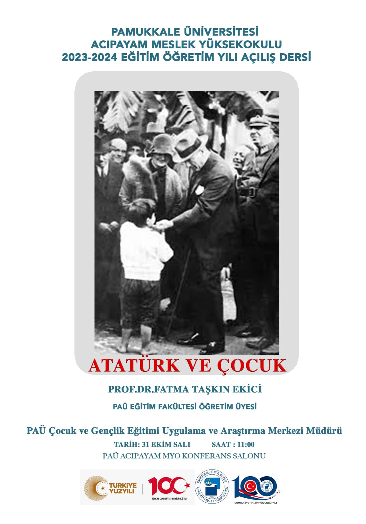 ATATÜRK VE ÇOCUK Konferans 31 Ekim 2023 Acıpayam Meslek Yüksekokulu Sahne Alanlar: PROF.DR. FATMA TAŞKIN EKİCİ Organizatör: PAÜ ACIPAYAM MYO
