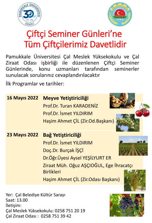 Çiftçi Seminer Günleri'ne Tüm Çiftçilerimiz Davetlidir Seminer 16 Mayıs 2022 - 23 Mayıs 2022 Çal Belediye Kültür Sarayı