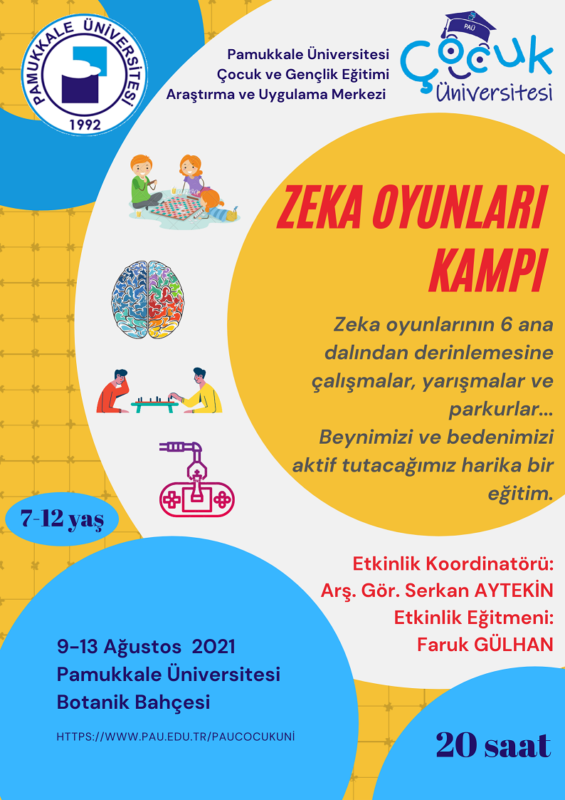 5 günde toplam 20 saatlik eğlenceli ve verimli geçecek zeka oyunları kampımıza 7-12 yaş grubundan tüm çocuklarımızı bekliyoruz.