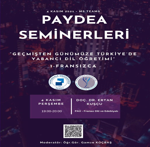 PAYDEA (Pamukkale Üniversitesi Yabancı Diller Yüksekokulu Dil ve Edebiyat Araştırmaları) Seminerleri Seminer 04 Kasım 2021 Online Pamukkale Üniversitesi Yabancı Diller Yüksekokulu Akademik ve Sosyal Faaliyetler Koordinatörlüğü’nün düzenlemekte olduğu PAYDEA (Pamukkale Üniversitesi Yabancı Diller Yüksekokulu Dil ve Edebiyat Araştırmaları) Seminerleri 2021-2022 akademik yılında da Microsoft Teams platformu üzerinden devam edecektir. Bu yıl “Geçmişten Günümüze Türkiye’de Yabancı Dil Öğretimi” olarak belirlediğimiz seminer serimizin ilki, 04.KASIM.2021 tarihinde “Geçmişten Günümüze Türkiye’de Yabancı Dil Öğretimi – FRANSIZCA” başlığıyla Pamukkale Üniversitesi, Fen Edebiyat Fakültesi, Fransız Dili ve Edebiyatı Bölümü öğretim üyesi Doç. Dr. Ertan KUŞÇU tarafından gerçekleştirilecektir. Seminerimiz ücretsiz olup afişteki QR kodu okutarak veya aşağıdaki erişim bağlantısına tıklayarak katılabilirsiniz. 4 KASIM PERŞEMBE akşamı saat 19.00’da sizleri aramızda görmekten mutluluk duyarız. ERİŞİM BAĞLANTISI https://teams.microsoft.com/l/meetup-join/19%3ameeting_MjExNTM3NWEtMjYyYi00NzRhLWE0YTYtYmYxZDQyN2QyMTYx%40thread.v2/0?context=%7b%22Tid%22%3a%224b55b462-e98f-4bba-a0b1-9d792ff93016%22%2c%22Oid%22%3a%221660c6d7-fa2f-4899-b665-e67d21f1b6f6%22%7d