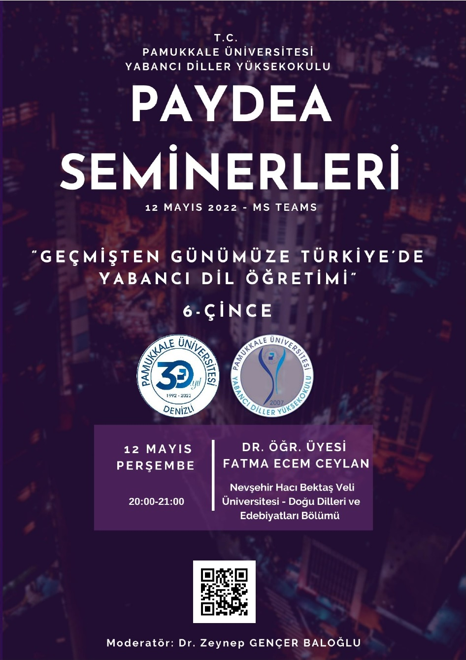 Yüksekokulumuz Akademik ve Sosyal Aktive Koordinatörlüğünün Microsoft Teams üzerinden düzenlediği "Geçmişten Günümüze Türkiye'de Yabancı Dil Öğretimi" adlı PAYDEA (Pamukkale Üniversitesi Yabancı Diller Yüksekokulu Dil ve Edebiyat Araştırmaları) seminer serimizin altıncısı olan "Geçmişten Günümüze Türkiye'de Çince Öğretimi" seminerimiz 12 Mayıs 2022 tarihinde saat 20.00'da gerçekleştirilecektir. Konuğumuz, Nevşehir Hacı Bektaş Veli Üniversitesi/Fen-Edebiyat Fakültesi/Doğu Dilleri ve Edebiyatları Bölümü/Çin Dili ve Edebiyatı Anabilim Dalı öğretim üyesi Dr. Öğr. Üyesi Fatma Ecem CEYLAN olacaktır. Seminerimiz ücretsiz olup afişteki QR kodu okutarak veya erişim bağlantısına tıklayarak katılabilirsiniz.