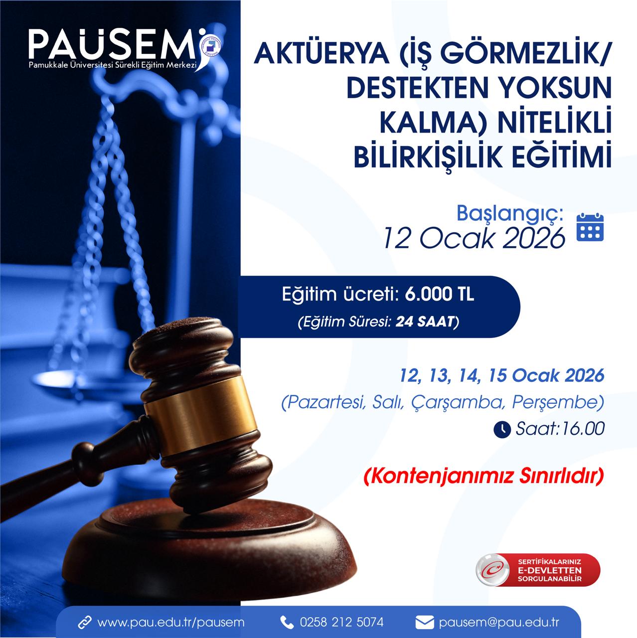 12 Ocakta başlayacak Aktüerya (İş Göremezlik / Destekten Yoksun Kalma) Eğitimine kayıtlarımız devam etmektedir. Güncellenme Tarihi: 07 Ocak 2026 https://www.pau.edu.tr/pausem/tr/sayfa/aktuerya-is-goremezlikdestekten-yoksun-kalma-egitimi