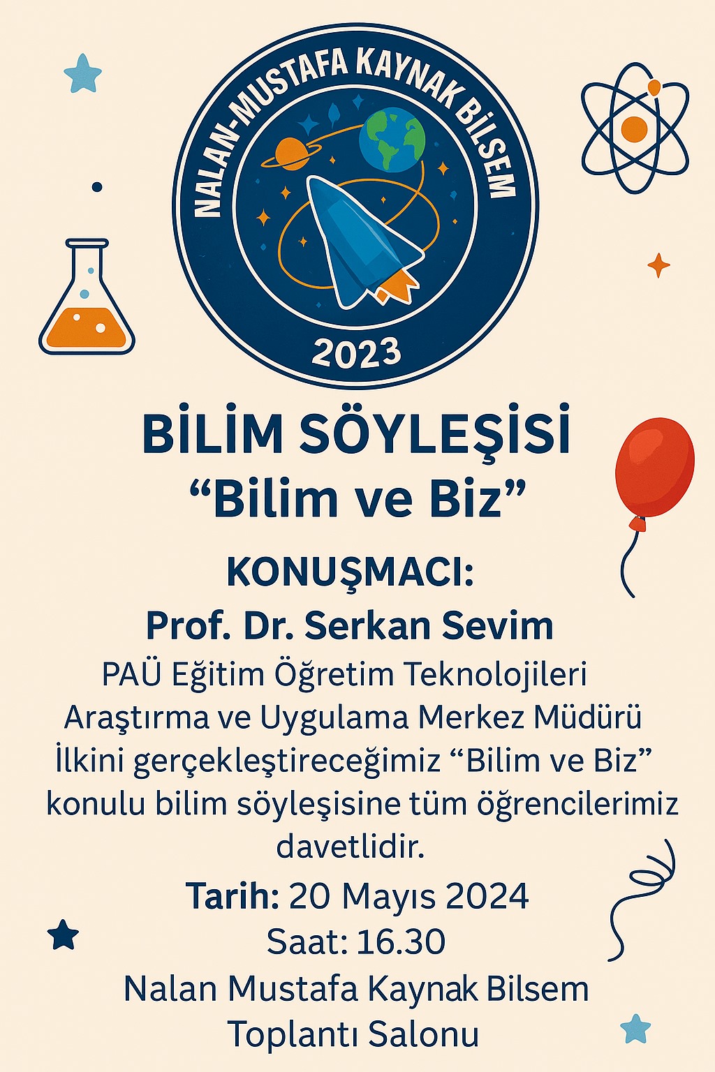 Nalan Mustafa KAYNAK Bilim ve Sanat Merkezinde düzenlenen Bilim Söyleşileri kapsamında düzenlenen seminerlerin ilki Merkez müdürümüz Sayın Prof. Dr. Serkan SEVİM tarafımdan gerçekleştirildi. Seminerde Bilim ve Sanat merkezi öğrencilerine Bilim ve Teknoloji, Bilimin Doğası, STEAM ve Eğitimde Yapay Zeka konularında bilgi verildi. Seminerin ardından öğrencilerin sorularının cevaplandığı Soru Cevap bölümü ile program sonlandırıldı.