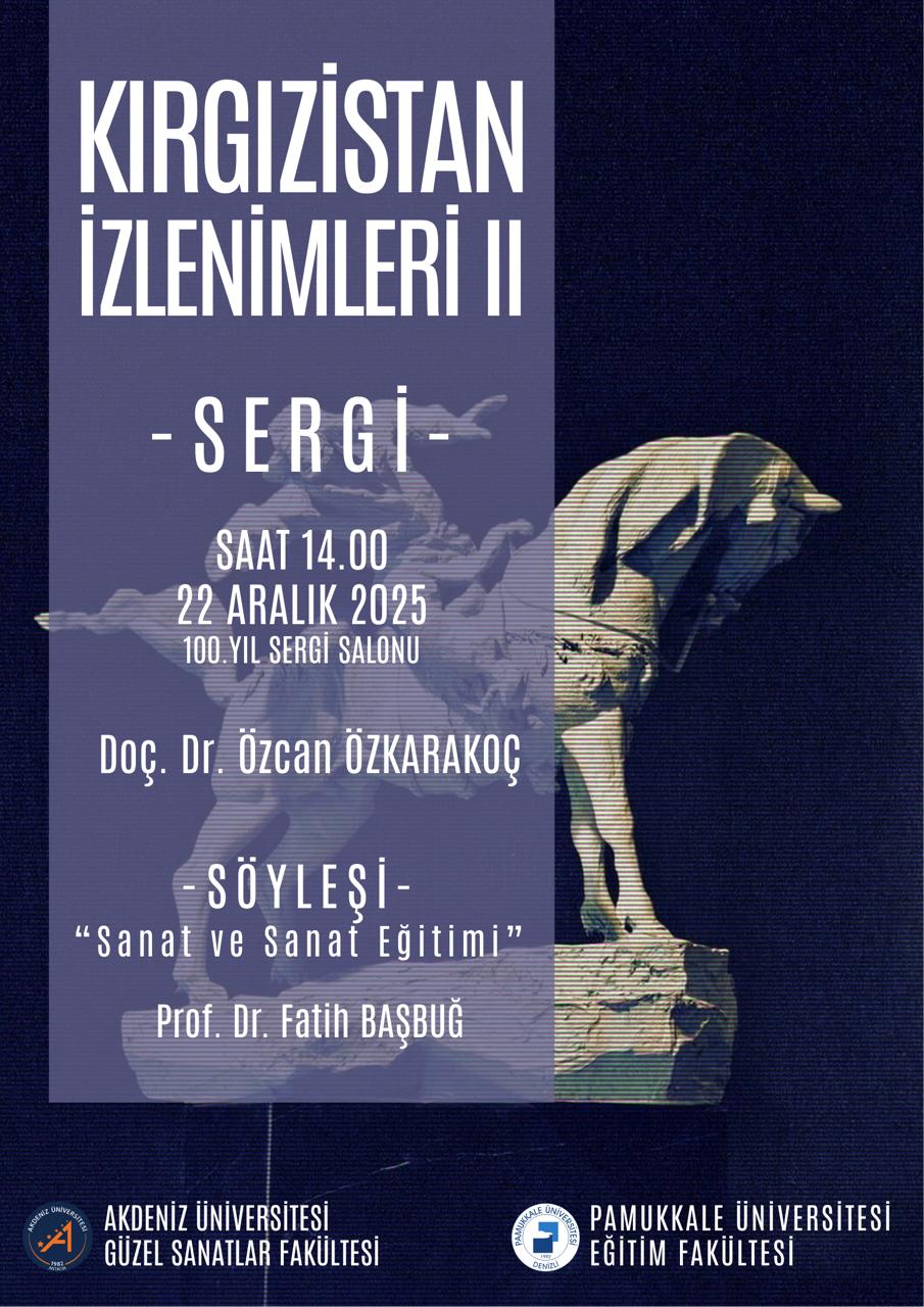 Akdeniz Üniversitesi Güzel Sanatlar Fakültesi Heykel Bölüm Başkanı Doç. Dr. Özcan Karakoç ile Akdeniz Üniversitesi Güzel Sanatlar Fakültesi Resim Bölüm Başkanı Prof. Dr. Fatih Başbuğ, 22 Aralık 2025 günü saat 15.00’te fakültemiz öğrencileri ve akademik personeline yönelik “Sanat ve Sanat Eğitimi” başlıklı bir konferans verecek ve Doç. Dr. Özcan Karakoç’ın 22 Aralık 2025 – 5 Ocak 2026 tarihleri arasında, Pamukkale Üniversitesi 100. Yıl Sergi Salonunda "Kırgızistan İzlenimleri II" isimli kişisel heykel sergisi açılacaktır, sergi açılışı 22 Aralık 2025 saat 14.00’te gerçekleştirilecektir.