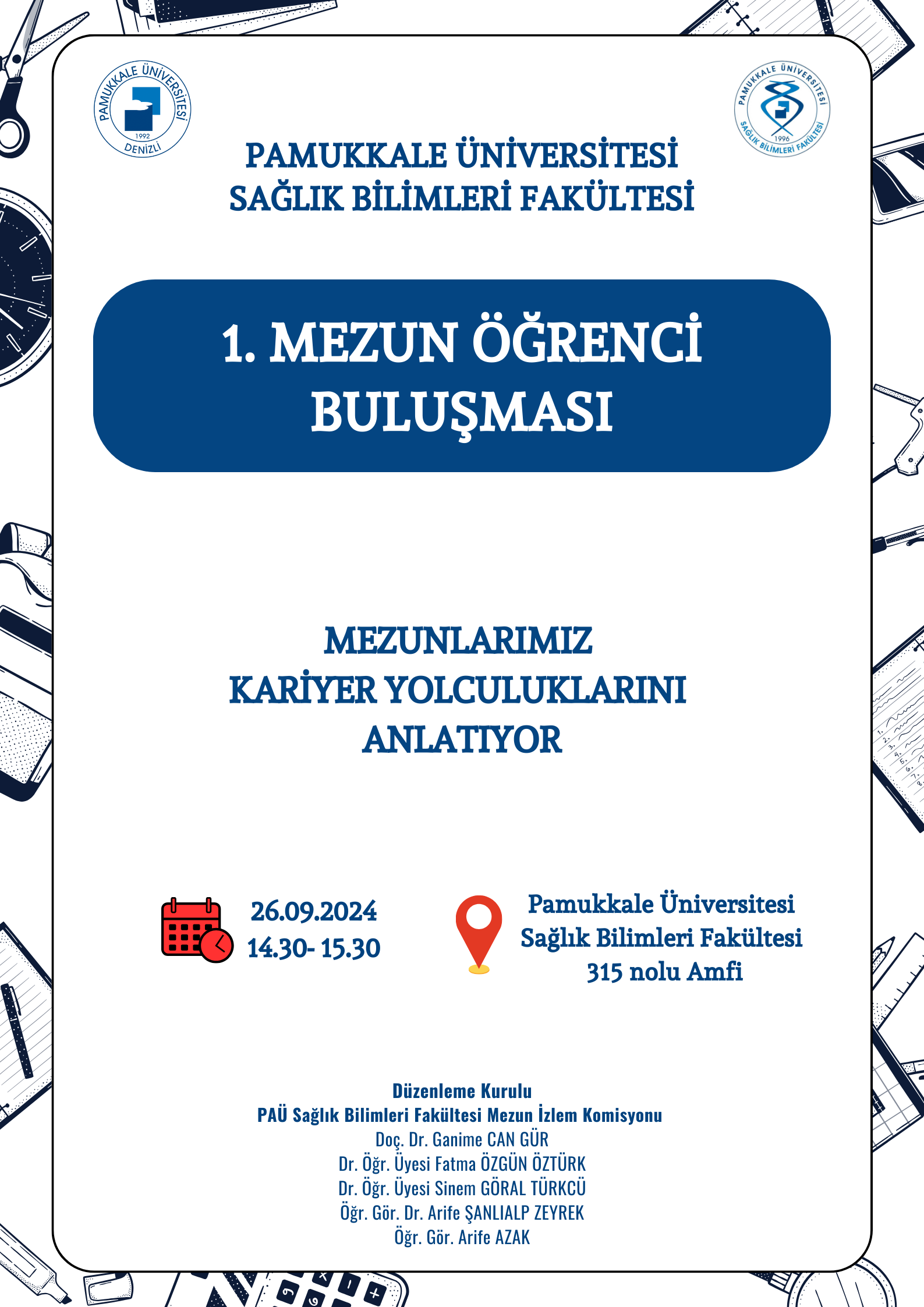 Sağlık Bilimleri Fakültesi Mezun İzlem Komisyonu etkinlikleri kapsamında, 26.09.2024 Tarihinde, saat 14:30’da Sağlık Bilimleri Fakültesi 315 numaralı amfide ‘’1. Mezun Öğrenci Buluşması’’ gerçekleştirilecektir. Etkinliğimize tüm öğrenciler davetlidir.