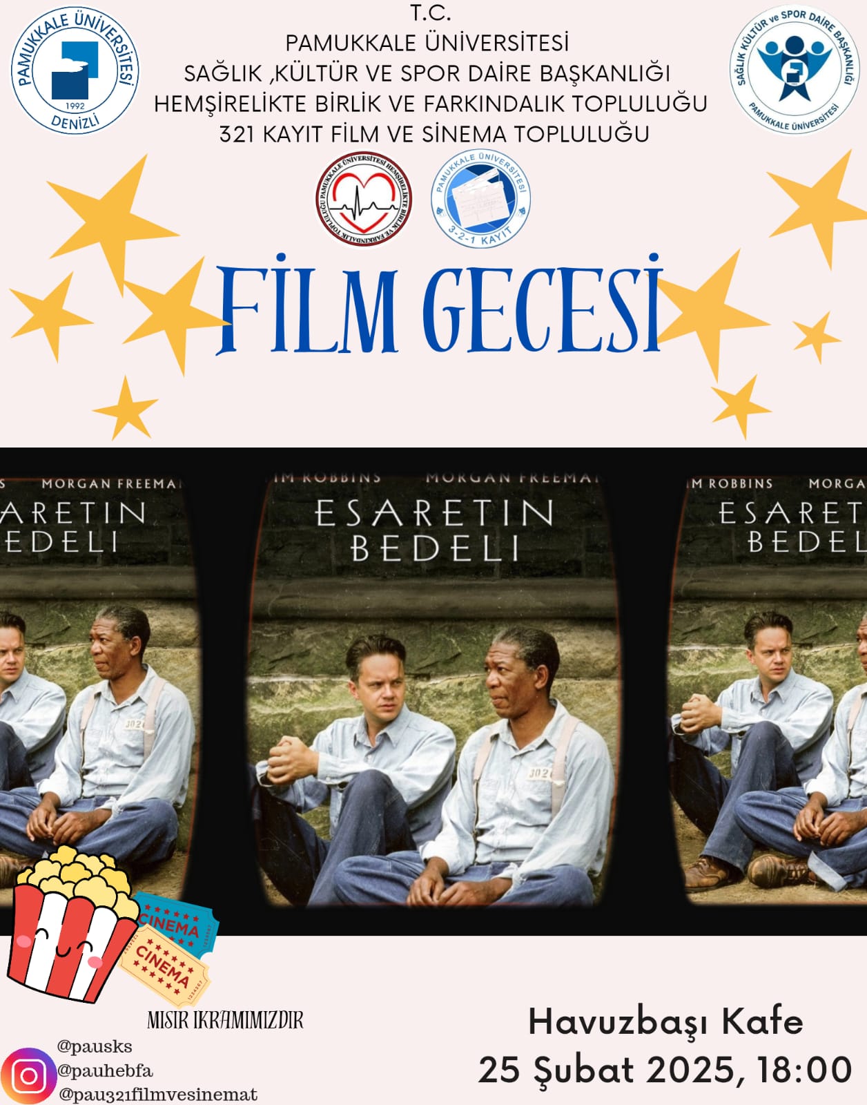 Hemşirelikte Birlik ve Farkındalık Topluluğu olarak 3-2-1 Kayıt Film ve Sinema Topluluğu ile birlikte üyelerimizle Esaretin Bedeli adlı ödüllü filmi izleyerek güzel ve eğlenceli bir akşam geçirdik.