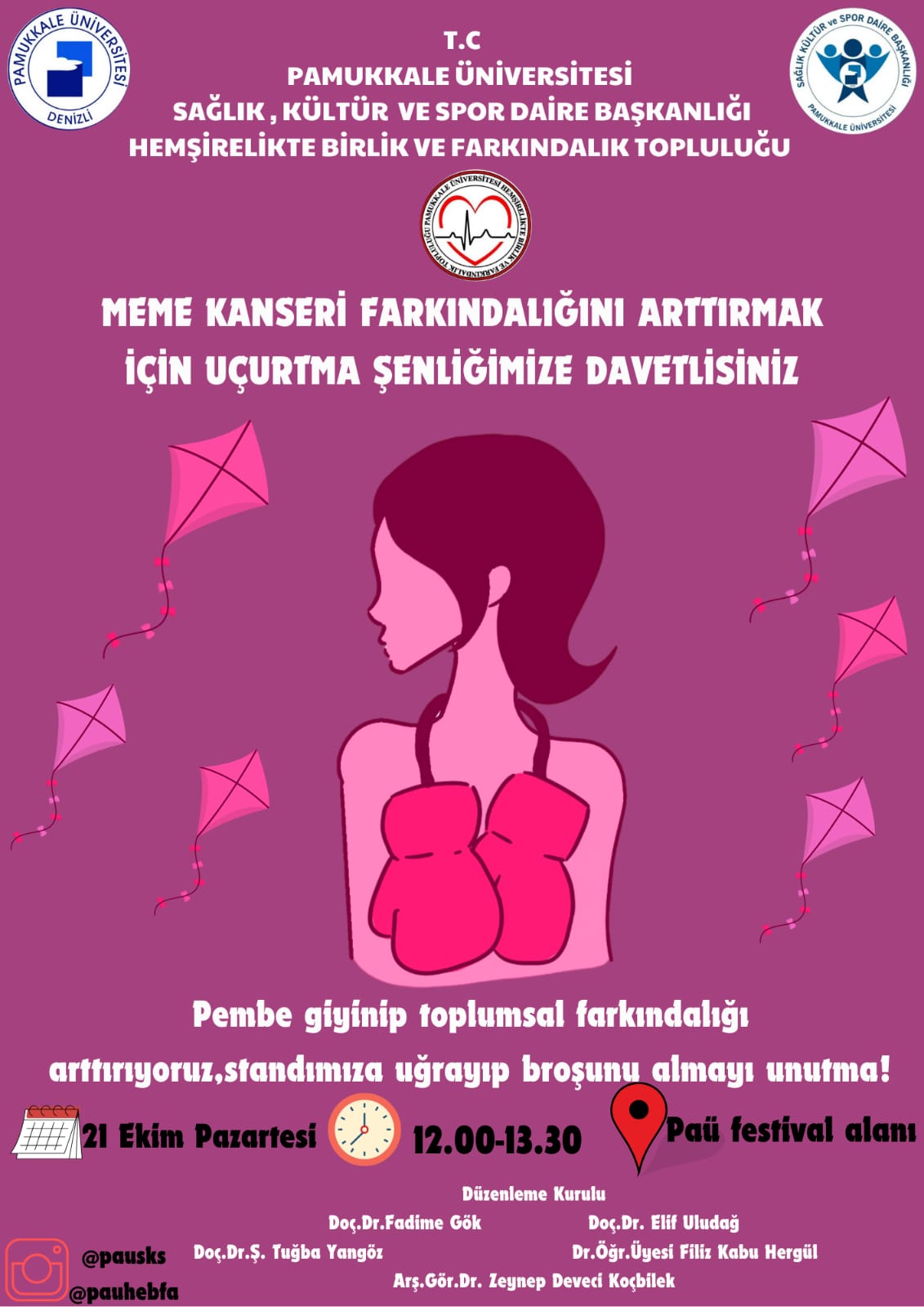Meme kanseri hakkında toplumları bilinçlendirmek için 1985'te Amerikan Kanser Birliği tarafından ekim ayı Meme Kanseri Farkındalık Ayı olarak ilan edilmiş ve buna yönelik etkinlikler yapılmıştır. Sonrasında Dünya Sağlık Örgütü 2004 yılında 1-31 Ekim tarihleri arasını Meme Kanseri Bilinçlendirme ve Farkındalık Ayı olarak belirlemiştir. Bu tarihten itibaren ülkemizde de Pembe Ekim Meme Kanseri Farkındalık Ayı olarak etkinlikler düzenlenmektedir. Bu bağlamda meme kanseri ile ilgili çalışan uluslararası kuruluşlar, sivil toplum kuruluşları, akademisyenler başta olmak üzere birçok etkinlik yapılmaktadır. Biz de HEBFA topluluğu olarak üniversite öğrencilerinin meme kanseri konusunda farkındalıklarını artırmak için pembe uçurtma etkinliği düzenledik. Etkinliğimizi 21 Ekim Pazartesi günü 12.00 - 13.30 saatleri arasında PAÜ rektörlük önü çim alanda gerçekleştirdik.