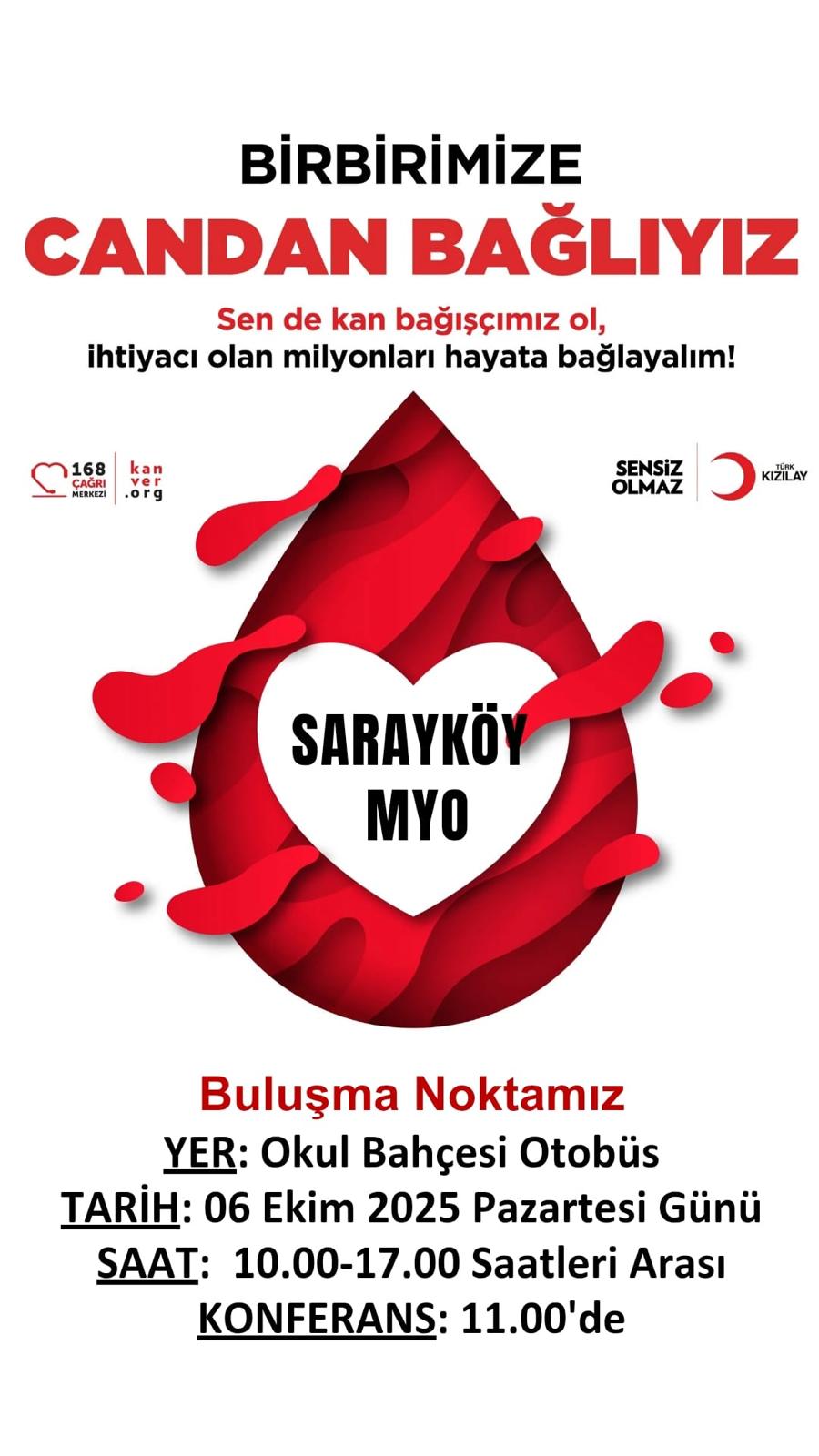 Kan Bağışı Seferberliği ve Bilgilendirme Eğitimi Eğitim 06 Ekim 2025 - 13 Ekim 2025 Sarayköy Meslek Yüksekokulu 06.09.2025 saat 11.00'de Yüksekokulumuzda Kan Bağışı Bilgilendirme Eğitimi yapılacaktır. Saat 10.00-17.00 arası Sarayköy MYO Kan Bağışı kampanyası yapılacaktır.