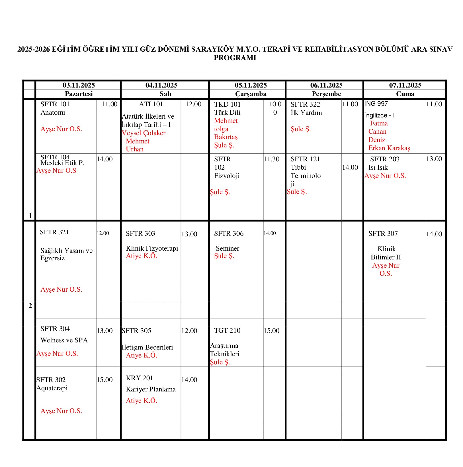 2025-2026 FİZYOTERAPİ PROGRAMI ARA SINAV TARİHLERİ