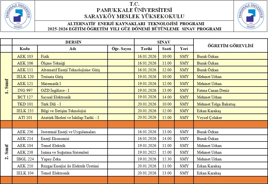 ALTERNATİF ENERJİ KAYNAKLARI TEKNOLOJİSİ PROGRAMI BÜTÜNLEME SINAVI TARİHLERİ Güncellenme Tarihi: 14 Ocak 2026