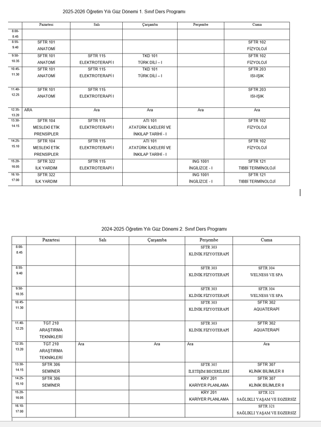 FİZYOTERAPİ PROGRAMI 2025-2026 Yılı Güz Dönemi Haftalık Ders Programı Güncellenme Tarihi: 26 Eylül 2025