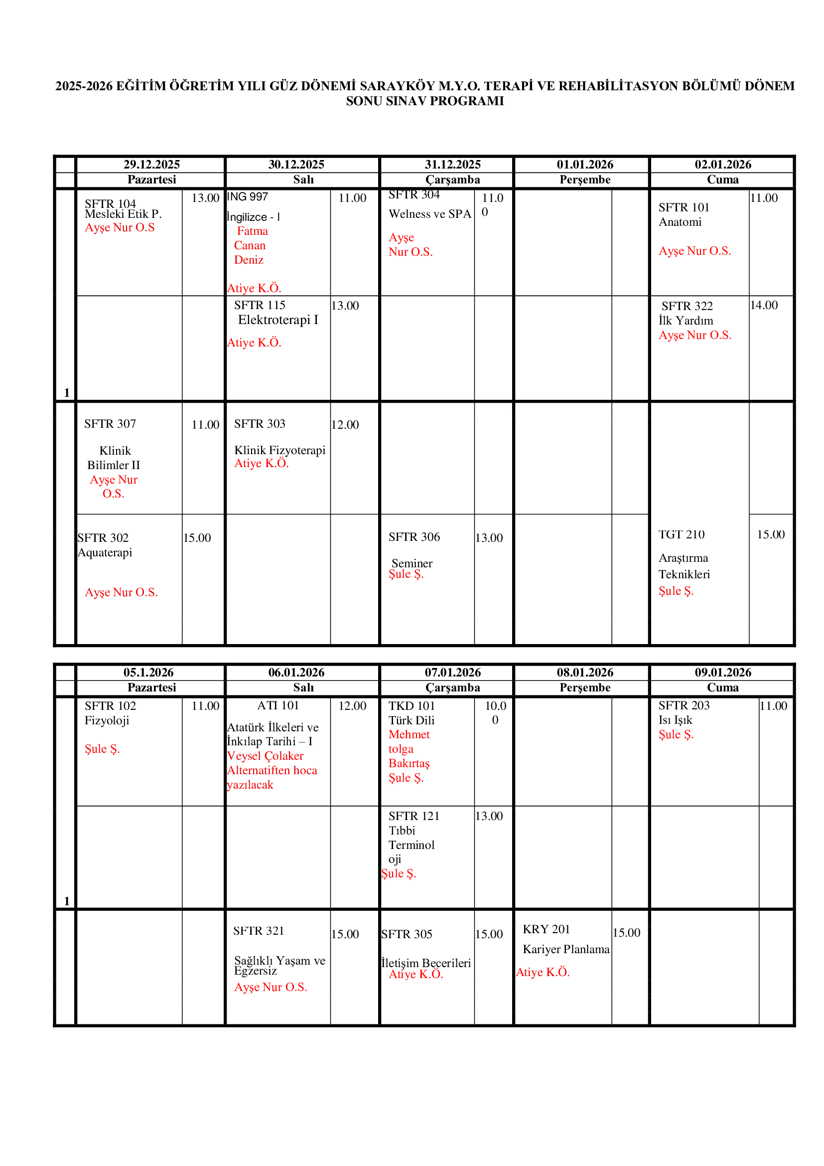 FİZYOTERAPİ PROGRAMI DÖNEM SONU SINAV TARİHLERİ