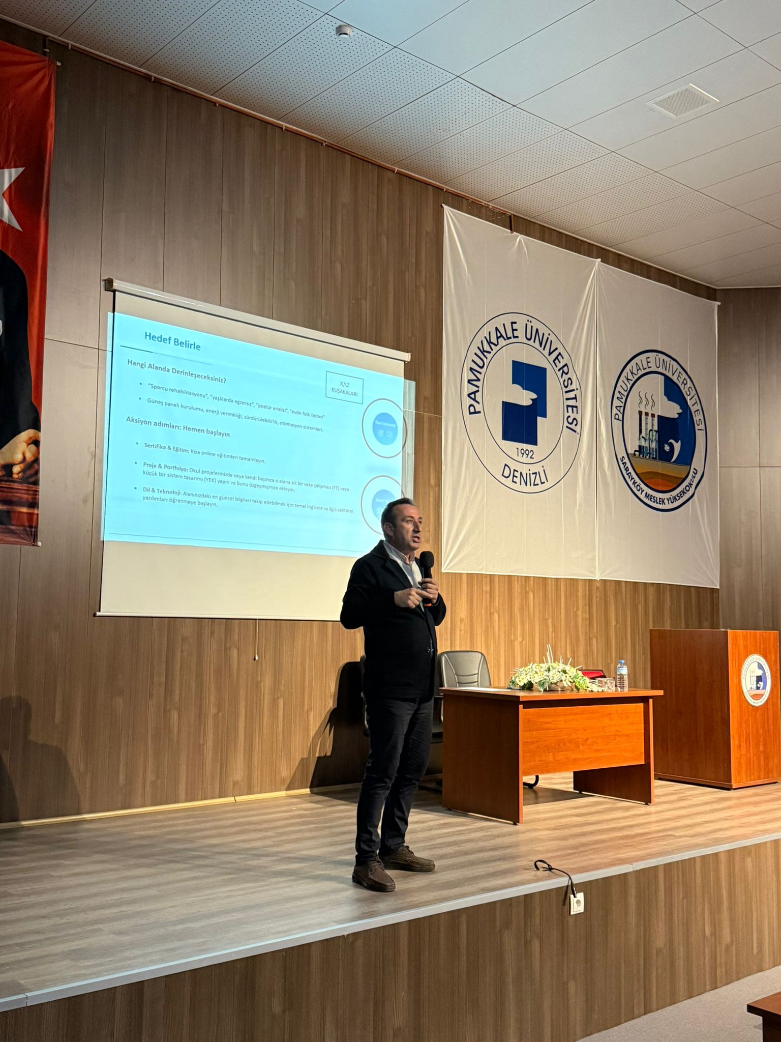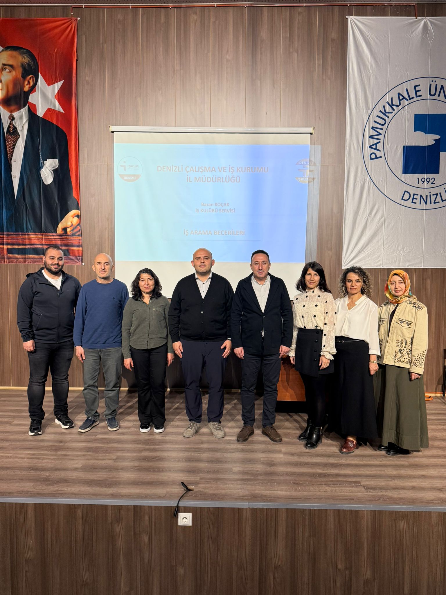 24.11.2025 tarihinde Sarayköy MYO' öğrencilere yönelik kariyer planlama, CV hazırlama konusunda eğitim semineri düzenlendi. İŞKUR İL Müdürlüğü'nden iş kulübü lideri ve meslek danışmanı Sn. Baran Koçak tarafından 'Öğrencilikten İş Hayatına' başlıklı sunum gerçekleştirildi. Öğrencilerimizin yoğun katılım gösterdiği etkinlikte okulumuz idari ve akademik personeli de hazır bulundu. Okulumuz programları özelinde örnekler ile gerçekleştirilen sunum öğrencilerimizin kariyer yolculuğu açısından oldukça faydalı oldu. Etkinlik sonunda Sarayköy MYO Müdürü Doç. Dr. Koray Şarkaya tarafından günün anısına hediye takdim edildi. Bu etkili sunum için Sn. Baran Koçak'a çok teşekkür ederiz.