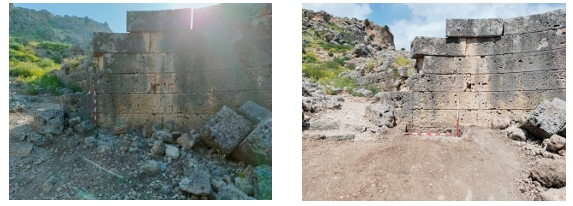 Ana Kent Kapısı’nın avlu bölümünün doğu duvarı önünde bilimsel bir sondaj kazısı gerçekleştirilmiştir (fig.48) Burada yapının kronolojik görünümü ve statik yapısı anlamak amacıyla açılan sondaj 1,50 x 1,10 m ölçülerinde olup 1,30 m derinliğe sahiptir. İki dikey (0,50 m), bir yatay (0,30 m) iki duvar bloğuyla duvarın zemine kadar devam ettiği anlaşılmıştır. Yapının temel seviyesinden başlayan en alttaki yatay blok duvardan 0,15 m dışarı çıkıntılı olup duvarın kaidesini oluşturan bir topuk biçiminde tasarlanmıştır. Kazı çalışmaları sırasında tanımlanabilir herhangi bir buluntuya rastlanılmamıştır. Çalışmaların devamında temizlik ve fotoğraf çalışmaları yapılıp koruyucu önlemler alınarak çalışma sonlandırılmıştır.
