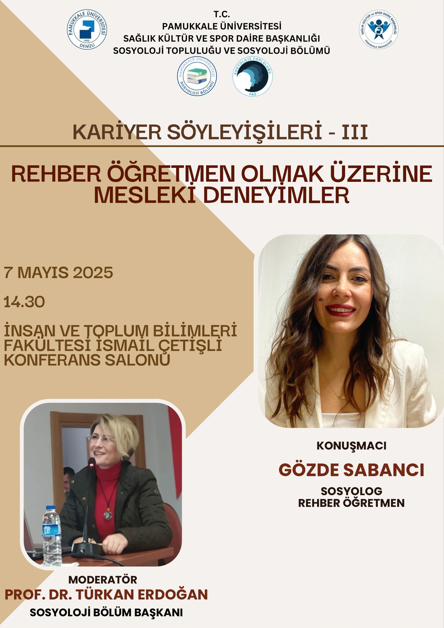 Bölüm başkanımız Prof. Dr. Türkan Erdoğan'ın moderatörlüğünü yapacağı etkinlik kapsamında sosyolog ve aynı zamanda Rehber Öğretmen olan Gözde Sabancı, Rehber Öğretmenliği kariyer deneyimlerini öğrencilemizle paylaşacaktır.