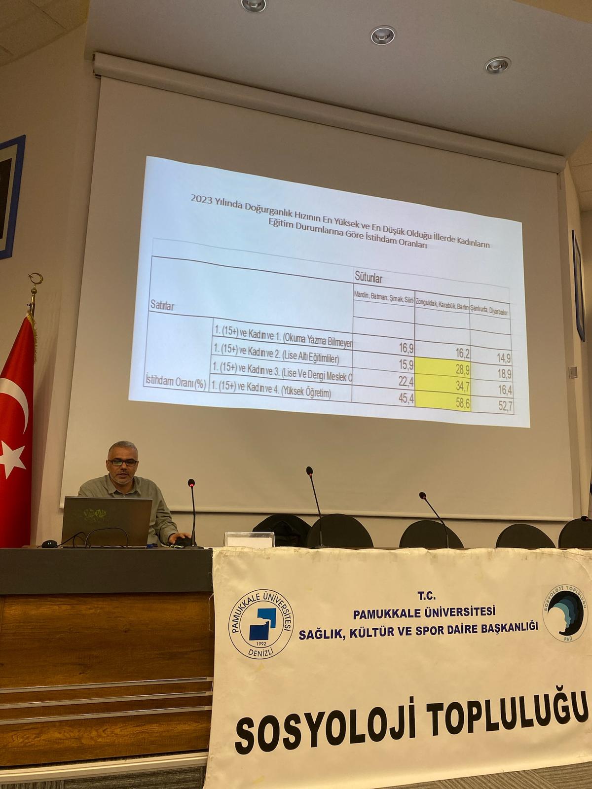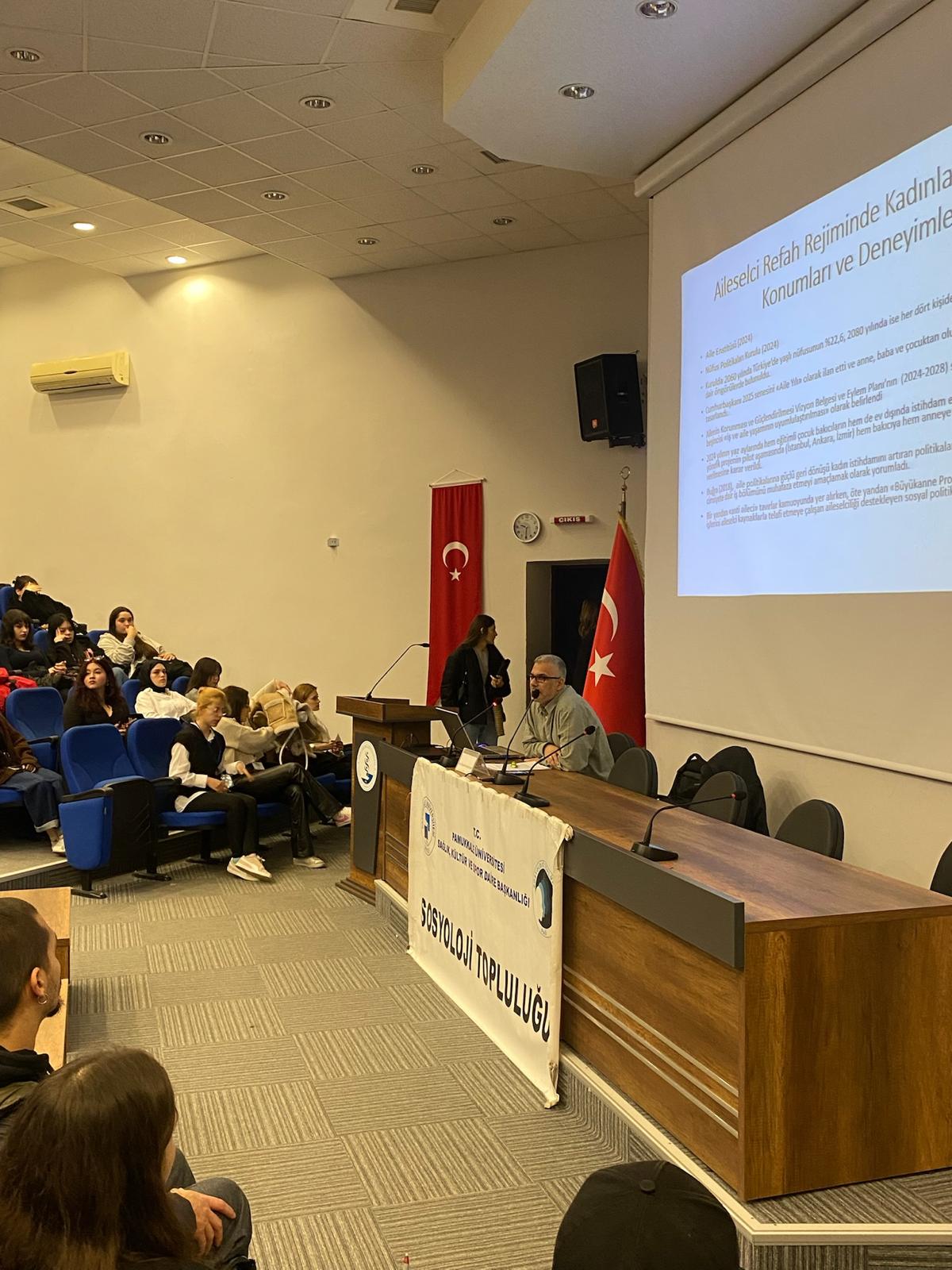 Sosyoloji Bölümü ve Sosyoloji Topluluğu, 8 Mart Dünya Emekçi Kadınlar Günü Kapsamında 3 Mart Pazartesi günü saat 15.00'da Prof. Dr. İsmail Çetişli konferans salonunda "Aileselci Refah Deneyiminde Kadınların Nesnel Konumları ve Deneyimleri" başlıklı bir konferans gerçekleştirildi. Konferansı veren Sosyoloji Bölümü öğretim üyesi Doç. Dr. Mustafa Gültekin bizatihi kendi yürüttüğü saha çalışmalarından elde ettiği verilerle iş yaşamında ve ev yaşamında bölünmek zorunda kalan kadın emeği üzerine güncel verileri yorumladı. Kadın emeğinin ciddi bir kısmının görünmez emek olduğunu ifade eden Gültekin, kadının iş hayatına yoğun katılımı sürecinde ortaya çıkan boşlukların Sosyal Politikalarla doldurulamaması neticesinde çocukların bakımı gibi oldukça temel sorunların aile içerisinde çözülmek durumunda kaldığını ve Aileselci çözümlerin hala oldukça yaygın olduğunu belirtti. Konferans dinleyici sorularının ardından sona erdi.