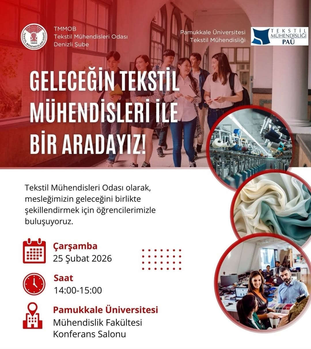Geleceğin Tekstil Mühendisleri ile Bir Aradayız! Etkinlik 25 February 2026 - 25 March 2026 Mühendislik Fakültesi Konferans Salonu Guests: TMO Denizli Şube Yönetim Kurulu