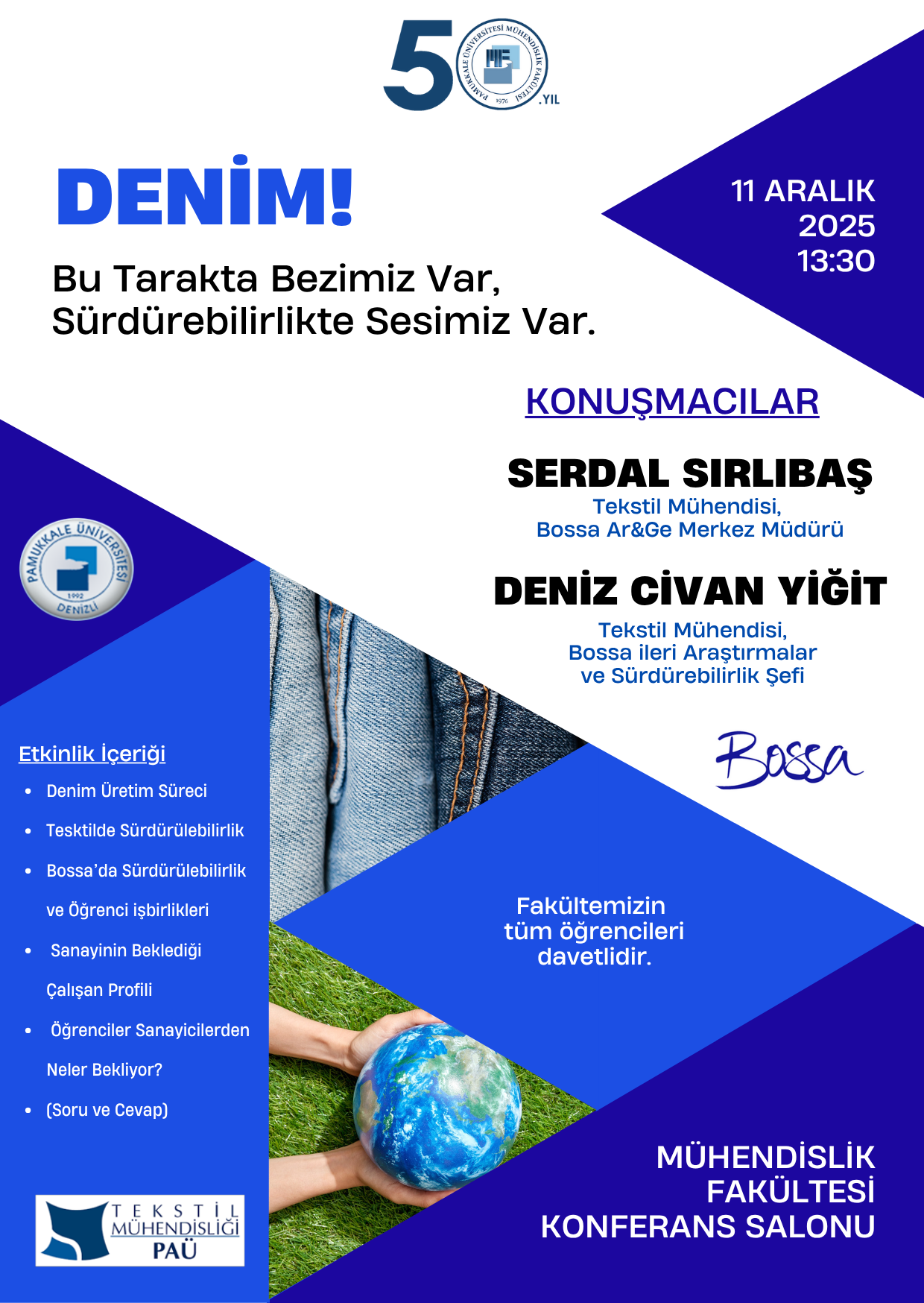 Fakültemizin kuruluşunun 50. yılında 50 etkinlik çerçevesinde, BOSSA Ar-Ge Merkezi Müdürü Sn. SERDAL SIRLIBAŞ ve İleri Araştırmalar ve Sürdürebilirlik Şefi Sn. Deniz CİVAN YİĞİT'in konuşmacı olarak katılacağı "Denim ! Bu Tarakta Bezimiz Var, Sürdürebilirlikte Sesimiz Var." etkinliğine davetlisiniz.