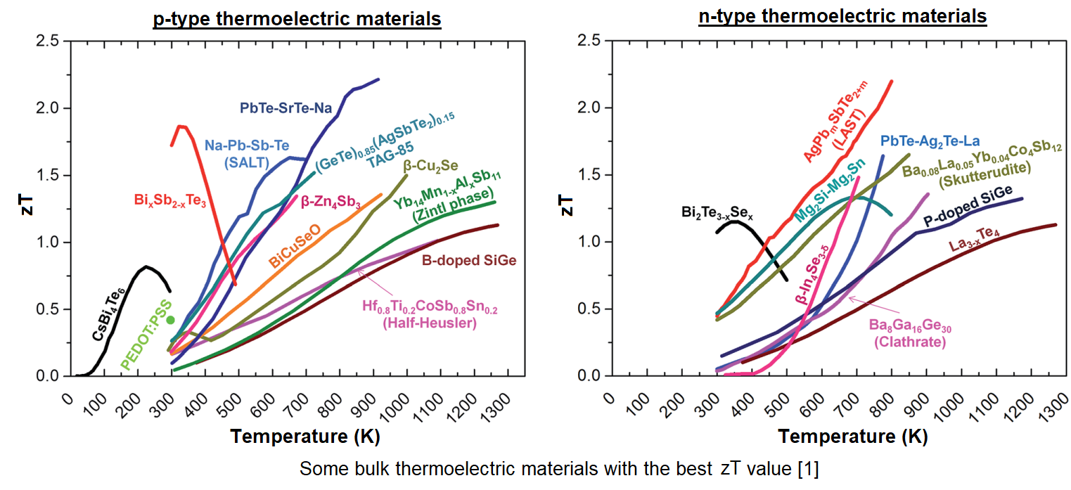 where, α: Seebeck coefficient (V/K), ρ: electrical resistivity (Ω.m), k: thermal conductivity coefficient (W/m.K), σ: electrical conductivity (S/m) and T: average temperature (K). Most of the TE devices used commercially today are based on Bi2Te3 or Sb2Te3 (Bismuth-tellurium). The ZT value of thermoelectric materials based bismuth-tellurium is approximately 1 at room temperature, and corresponding to this (ZT≈1), the efficiency of the TE device varies between 5-8%. The low efficiency of these materials compared to other systems enables scientists to focus on finding new generation TE material groups with high ZT values. Some of the bulk thermoelectric materials with the best ZT value are shown as below.