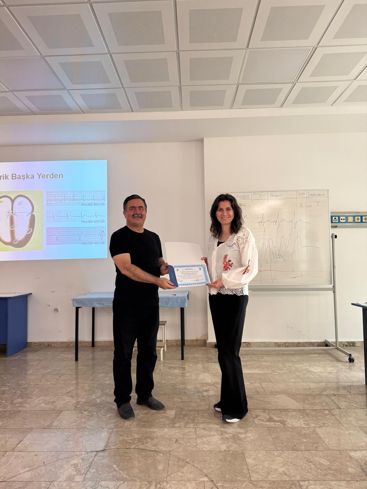 Denizli Sağlık Hizmetleri Meslek Yüksekokulu Anestezi Programı ve Acil Eğitim Gönüllüleri Koordinatörü Dr. Mustafa YORGANCI tarafından düzenlenen “Pratik EKG Okuma Eğitimi”, son dönem anestezi teknikeri öğrencileri için unutulmaz bir öğrenme deneyimi sundu. Eğitim 16.05.2025 tarihinde 09:00-17:00 saatleri arasında gerçekleştirildi. Eğitimde, alandaki tecrübesiyle tanınan Mustafa Yorgancı konuk eğitmen olarak yer aldı. Teorik bilgilerin yanı sıra uygulamalı anlatımlarla zenginleşen eğitim, öğrencilerin mesleki donanımlarını pekiştirmelerine katkı sağladı.