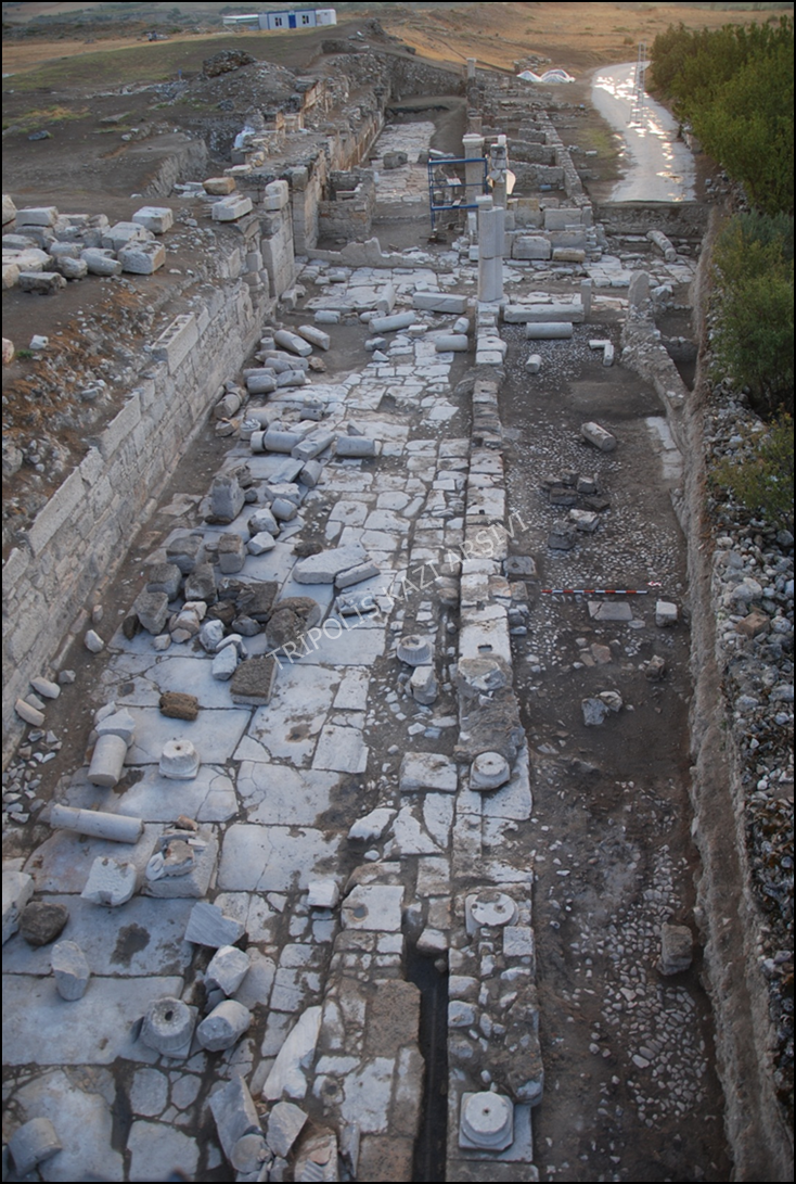 A stretch of 27 m in length of the east-west Colonnaded Street had been uncovered in the course of the first and second phases of excavations at Tripolis. The earth deposit of 2.20 m in thickness, 4.80 m in width and 12.70 m in length in the middle of the street was removed and the street pavement of large slabs was exposed.