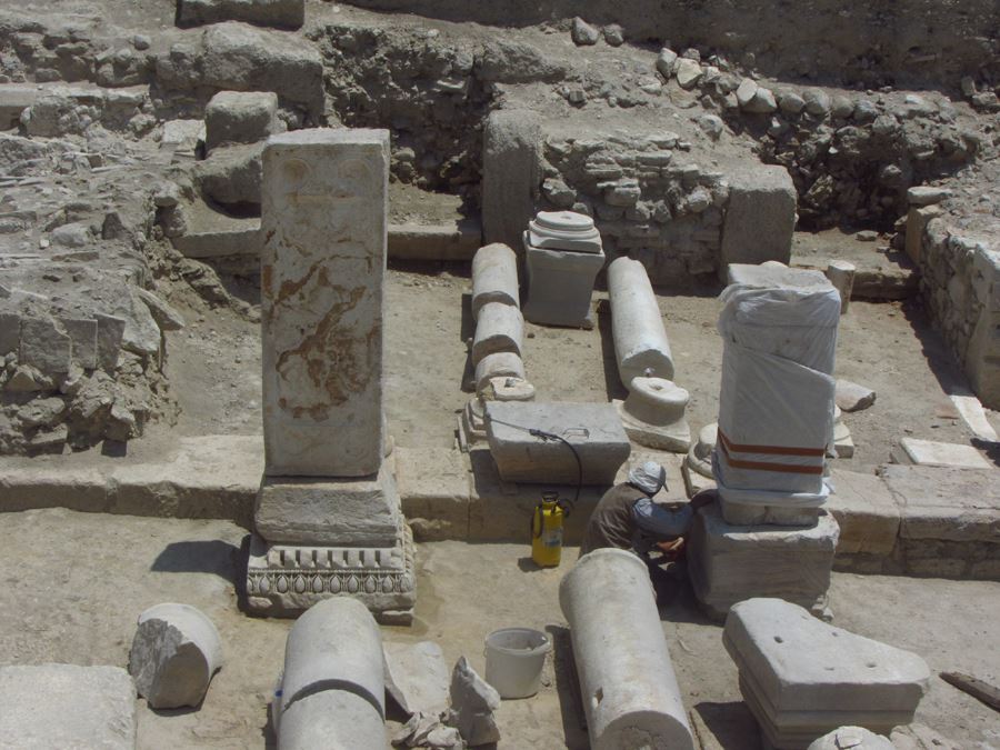 The east portico of Hierapolis Street is furnished with arrangements and rooms of the fifth and sixth centuries. The third room from the south has a hearth built mostly with bricks, travertine, marble and rubble in the northeast corner; the surface of the hearth was cleaned (Fig. 1).