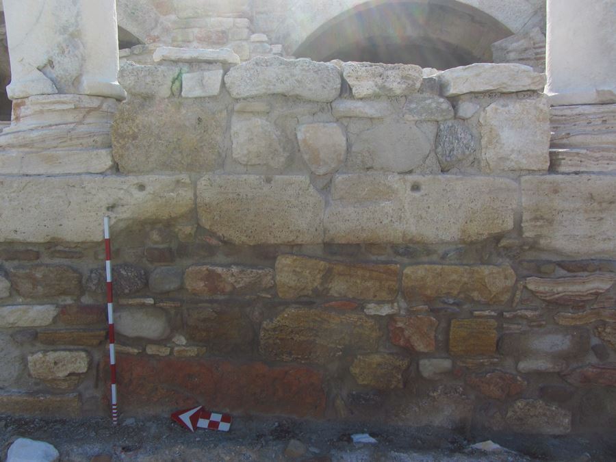 The mortar lines of the late period wall extending between the columns of the east portico’s colonnade and the entrance to the Arched Building were cleaned and loose stones were consolidated using mortar conforming to the authentic quality (Fig. 2).