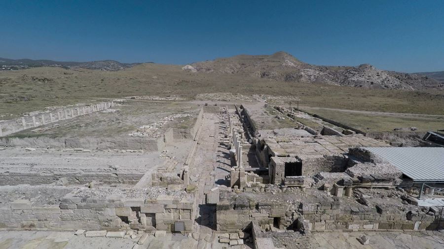 The total number of columns comprising two-piece shafts of white veined marble with medium pores reached twenty up to the Structure with Podium by the end of the 2015 campaign. The east side arrangement of Hierapolis Street was completed with square columns.