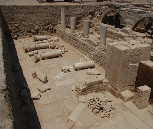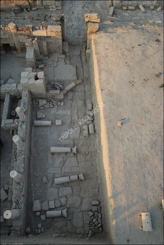 22.90 m. uzunluğundaki kısmı açığa çıkarılan Ara Sokak 2’nin doğusunda 1.21 m. yüksekliğindeki stylobat duvarı ve duvarın da üzerinde, Kemerli Yapı Batı Portiği’nin çatısını taşıyan 4.21 m. yüksekliğindeki sütunlar bulunmaktadır. Sokağın batı kısmı henüz kazılmamıştır (Figür 2).