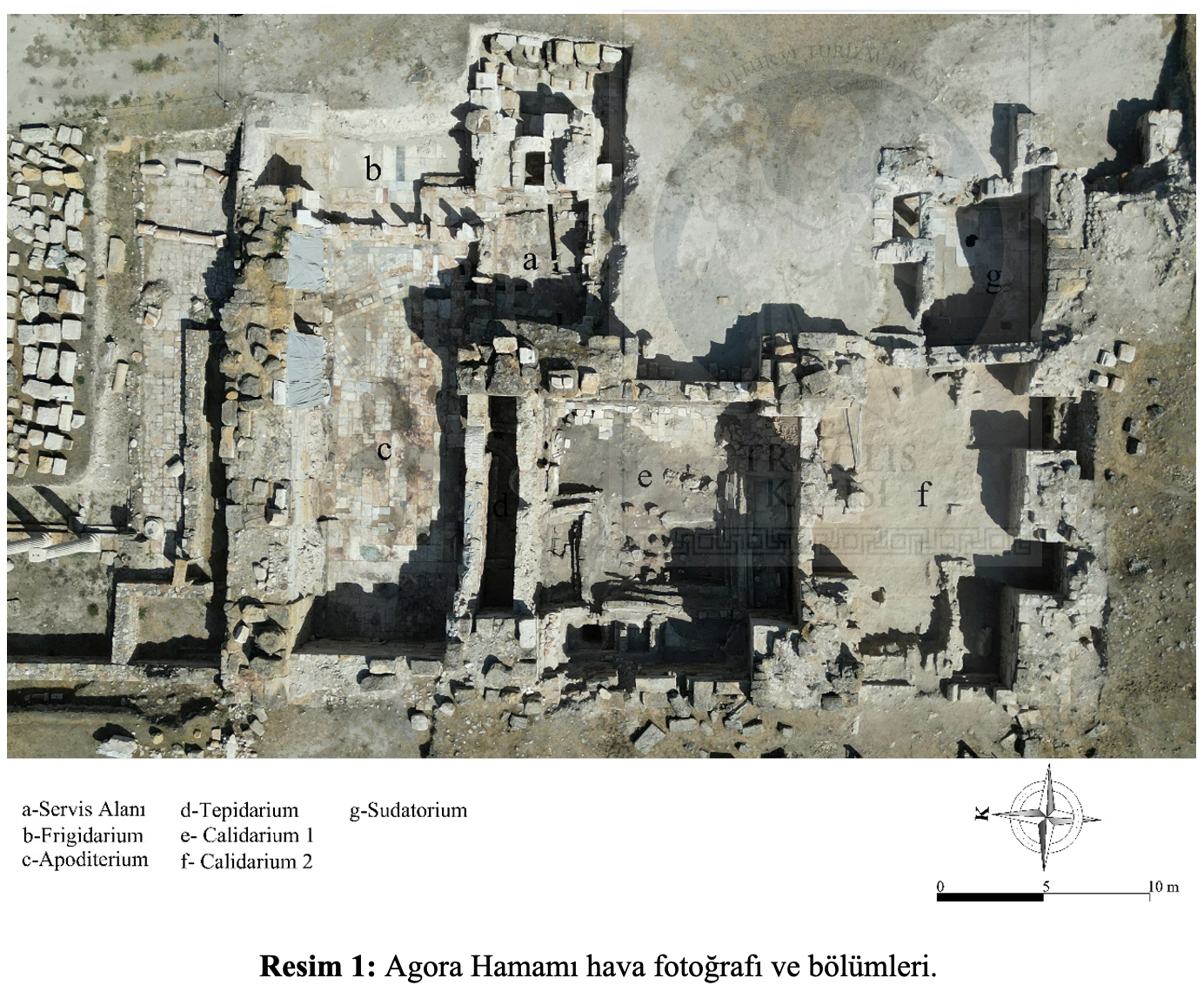 Geleceğe Miras Projesi kapsamında kazı çalışmaları yürütülen Agora Hamamı; MS 6.-7. yy.lara tarihlenen nadir yapılardan birini oluşturmaktadır. Bu anıtsal yapı, Tripolis’in Erken Roma İmparatorluk Dönemi’nden itibaren ana caddeler, sokaklar, sütunlu galeriler, Anıtsal Çeşme, Latrina, Kutsal Alan gibi kamu yapılarının bir arada toplandığı bir alana konumlandırılmıştır. Roma İmparatorluk Dönemi’ndeki ilk kullanımı olasılıkla bazilika olan yapının, Geç Antik Çağ’da fil ayaklarının aralarının duvarlarla kapatılmasıyla oluşturulan mekânlara ayrılarak hamam kompleksine dönüştürüldüğü anlaşılmıştır. Kazı çalışmalarından elde edilen verilerin değerlendirilmesi sonucunda, yapının inşa edildiği dönem itibariyle oldukça büyük bir alana yayılan hamam yapısı, kubbeli iki adet calidarium, beşik tonozlu bir tepidarium ve oldukça geniş dikdörtgen planlı bir apodyterium bölümünden oluşan sıralı tipte bir plana sahiptir. Frigidarium, sudatorium ve en az üç mekândan oluşan servis odaları da bu büyük yapı kompleksinin diğer bölümlerini oluşturmaktadır (Resim 1).