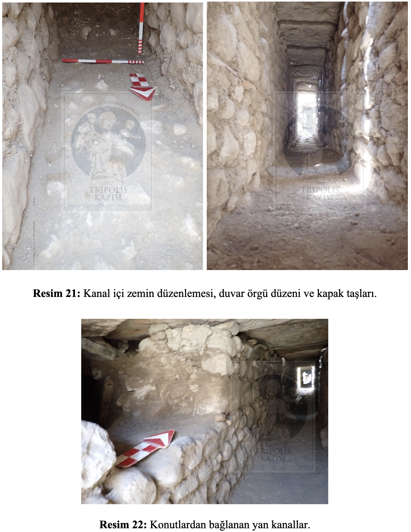 Kenti oluşturan ana yapı unsurlarından olan cadde ve sokakların altında, kent içerisindeki yapılardan çıkan atık suyun ve kentin bir yamaç kenti olması sebebiyle, yağmurlardan sonra oluşabilecek su taşkınlarının önlenebilmesi amacıyla kanalizasyon sistemleri yer almaktadır. Daha önceki çalışma yıllarında Ana Cadde altındaki kanalizasyon hattında kazı çalışmaları gerçekleştirilerek hattın yeniden işlevsel hale getirilmesi sağlanmıştır (https://www.pau.edu.tr/tripolis/tr/sayfa/2021-11link). 2025 yılı kazı çalışma programında da Konut Alanı’nda yer alan ve Mozaikli Konut Doğu Sokak olarak kayıt altına alınan, kuzey-güney doğrultulu sokağın altında bulunan, yıllarca erozyon ve sel tabakalarıyla tıkanmış vaziyetteki kanalizasyon sisteminde kazı ve onarım çalışmaları gerçekleştirilmiştir. Çalışmaların amacı kanalizasyon sistemini yeniden işlevsel hale getirerek kentin alt yapı sistemleri hakkında daha ayrıntılı bilgi sahibi olmak ve yağmur- erozyon tabakasının kent içerisinde birikmesini önlemektir. Ayrıca önümüzdeki yıllarda kentin güneyinde yapılacak olan karşılama merkezinde kullanılacak elektrik ve su sistemi hatlarına ait olacak kablo, boru vs. malzemelerin estetik açıdan gizli ve daha korunaklı bir şekilde kanal içerisinden geçirilerek karşılama merkezine aktarımını sağlamaktır (Resim 20).