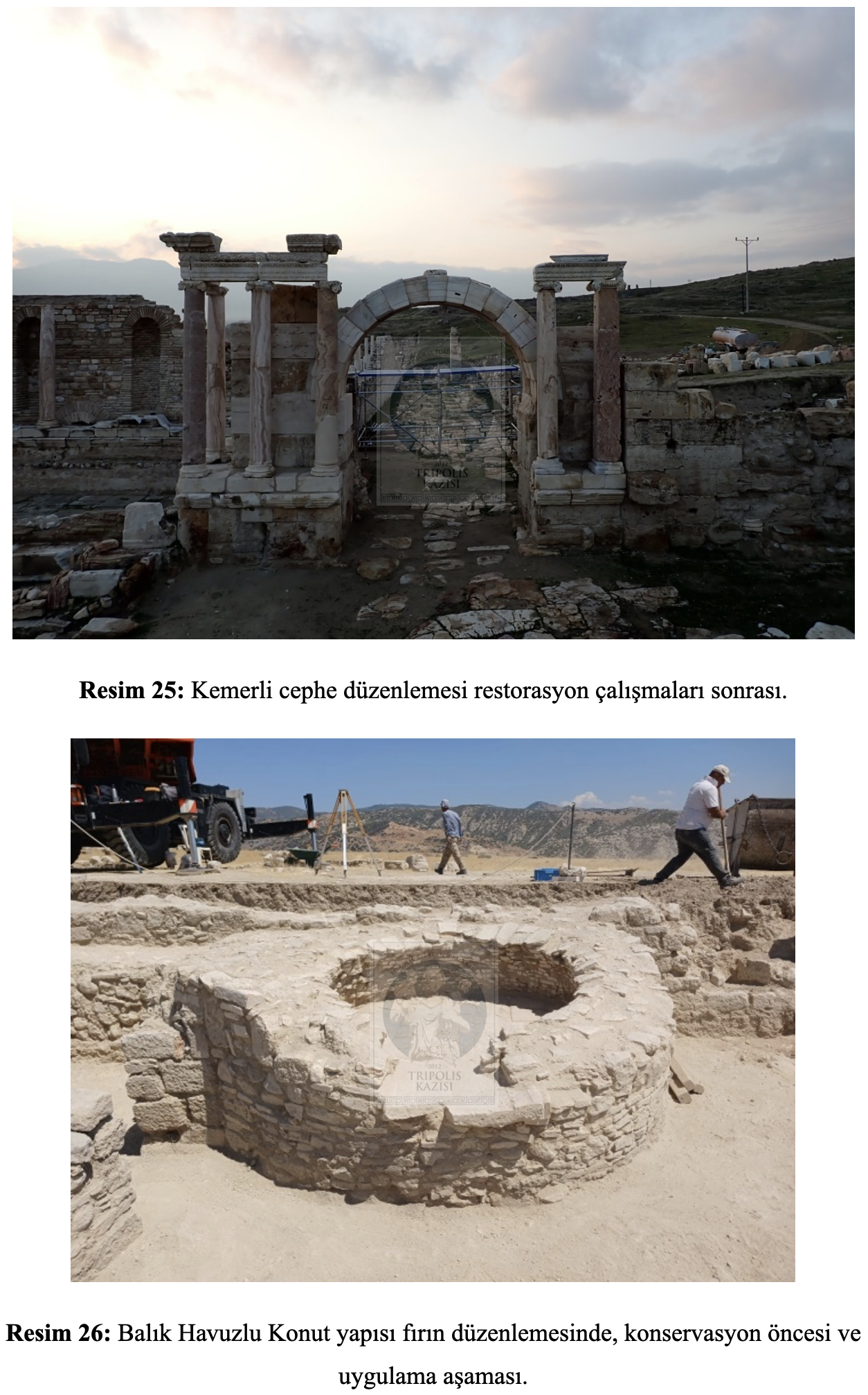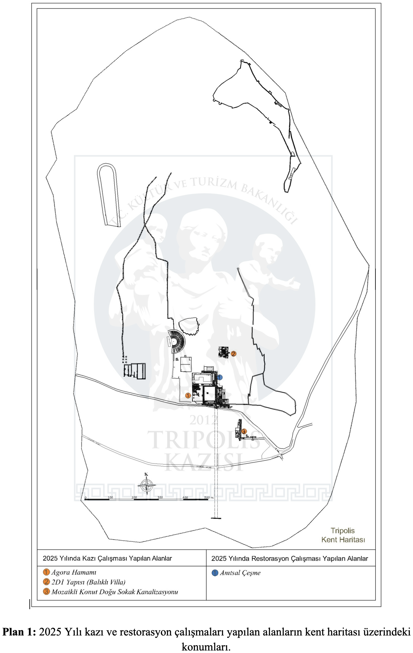Tripolis Antik Kenti 2025 yılı çalışmaları kent merkezine inşa edilmiş sivil ve kamusal yapıların içerisinde ve çevresinde zamanla doğal yollarla oluşan bitki örtüsünün temizliği ve çevre düzenleme çalışmalarıyla başlamış ve yıl boyunca belirli periyodlarla devam etmiştir. Arkeolojik kazı çalışmaları Geleceğe Miras Projesi ve 2025 yılı kazı programı kapsamında Agora Hamamı, 2D1 Yapısı (Balık Havuzlu Konut) ve Konut Alanı Doğu Sokak kanalizasyon çalışmaları ile sürdürülmüştür.