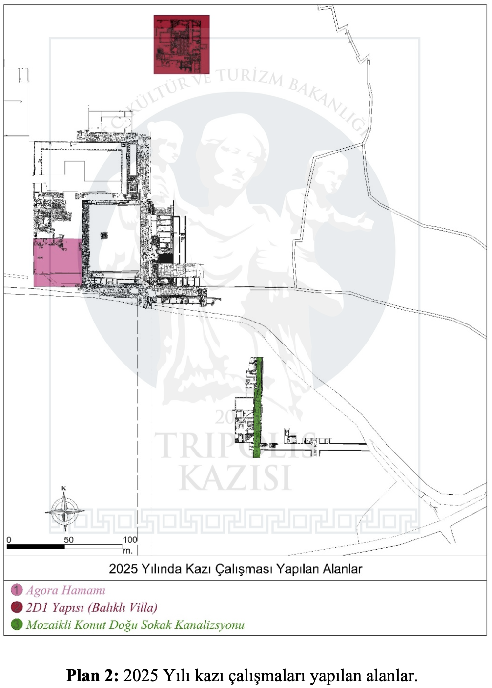 2025 yılı kazı çalışmaları Agora Hamamı, Mozaikli Konut Doğu Sokak Kanalizasyon hattı ve Balık Havuzlu Konut yapılarında gerçekleştirilmiştir (Plan 2).