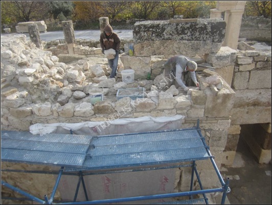 Apsisin doğu kısmında küçük bir kısmı korunmuş olan çay taşı, mermer ve traverten malzemeden yapılmış kubbe biçimli apsis çatısının korunan kısımlarının sağlamlaştırılması amacıyla altındaki boşluk kısımların orijinaline uygun malzeme ve toprak harç ile doldurulması işlemi gerçekleştirilmiştir (Figür 5).
