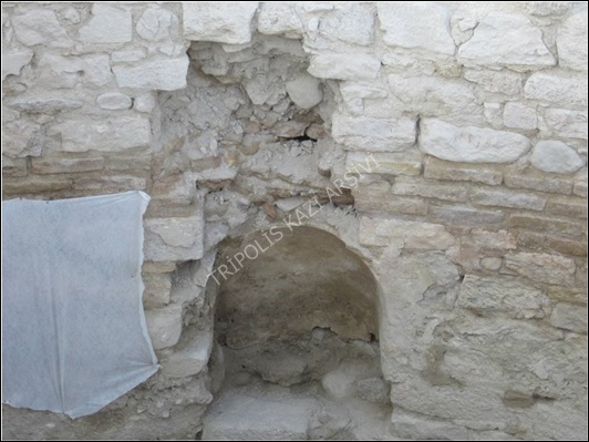 Beden duvarlarında gerçekleştirilen çalışmalarda yapının kuzey ve güney duvarlarındaki yıkılmış kısımlar da kazı sırasında bulunan orijinal yapı taşları kullanılarak restore edilmiştir (Figür 2). Apsisin güney duvarı üzerinde bulunan nişin üzerindeki bozulmuş durumdaki kemer de (Figür 3) tekrar örülmüştür (Figür 4).