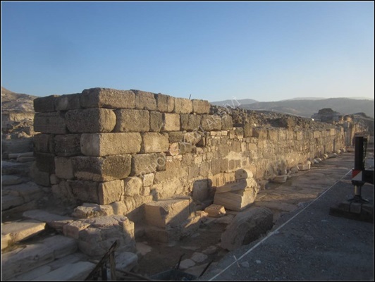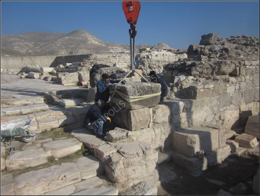 Sur kapısının doğu kısmındaki yıkılmış sur blokları (Figür 1) orijinal yerlerine vinç yardımı ile konularak (Figür 2) bu kısımdaki restorasyon çalışmaları tamamlanmıştır (Figür 3).