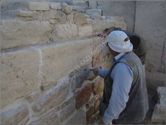 Portiğin batı kısmını sınırlayan stylobat duvarı üzerinde yükselen 4 sütun, portiğin batısında yer alan Ara Sokak 2'nin kazı çalışmalarında sokak üzerinde yıkıldıkları vaziyette tamburları ve başlıkları ile birlikte bulunmuştur. Tasnif alanına taşınan sütun elemanlarının temizlik ve restorasyon çalışmalarına paralel olarak sütunların yükseldiği stylobat duvarının ve portiğin doğu duvarının bozulmuş kısımlarında (Figür 1) orijinaline uygun biçimde çay taşı ve traverten malzeme kullanılarak tamamlama ve derz dolgusu yenileme işlemi uygulanmıştır (Figür 2).