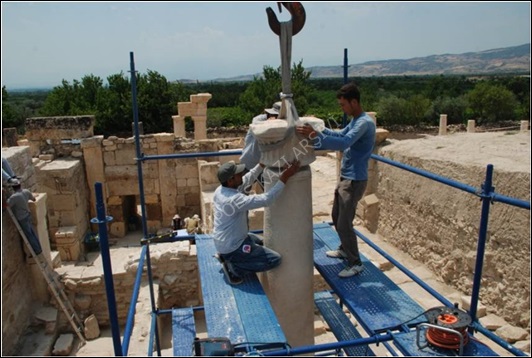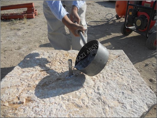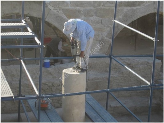 Provalar ile terazileri ayarlanarak tekrar tasnif alanına taşınan parçaların her birinin alt kısımlarına ortalama 13 cm'lik kısımları dışarıda kalacak şekilde krom-çelik dübeller yerleştirilmiştir (Figür 3). Parçaların üst kısımlarına da üzerine gelecek parçaya yerleştirilen dübel için delikler açılmıştır (Figür 4). Kaidelerin alt kısmına yerleştirilen dübeller için ise stylobat duvarı üzerinde dübel delikleri açılmıştır. Bu işlemin ardından dübel deliklerine sıvı araldit dökülerek parçalar tekrar stylobat duvarı üzerindeki orijinal yerlerine yerleştirilerek sütunların restorasyon işlemi tamamlanmıştır (Figür 5).