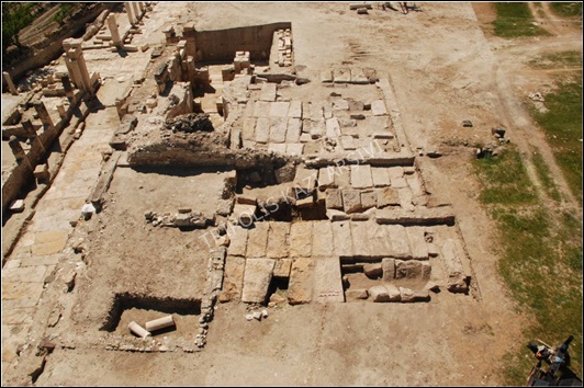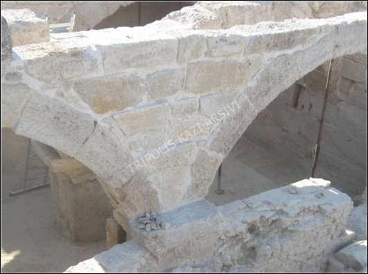 Kemer bloklarının yerleştirilmesinin ardından söz konusu kemer dizilerinin güney ve kuzey kemerleri arasında ve yeniden yapılan güney kemerler ile güney duvar arasında yapının orijinalinde bulunan çay taşı ve traverten malzeme kullanılarak kireç harç ile örülmüş duvarlar, kazı sırasında bulunan bu kısımlara ait olabilecek yapı taşları ile önce prova edilerek tekrar örülmüş ve gerek bu duvarların gerekse kemer bloklarının aralarına traverten harcı ile derz doldurma işlemi uygulanarak söz konusu kemerlerin restorasyon çalışmaları tamamlanmıştır (Figür 7). 4. kemer dizisinin kırılmış blokları, kırık yüzeylerindeki ölü tabakaların temizlenmesi ve provalarla yüzeylerin kavuşma noktaları tespit edildikten sonra epoksi reçine ile yapıştırılmış ve işkencelerle sıkıştırılarak düzgün ve sağlam bir şekilde birleşmeleri sağlanmıştır (Figür 8). Kemer dizilerinin restorasyon çalışmalarının tamamlanmasının ardından restorasyonu tamamlanan tavan blokları, yapı üzerindeki orijinal yerlerine tekrar yerleştirilmiş, kemerlere oturdukları kısımlarda boşluk olan kısımları da traverten harcı ile doldurulmuştur (Figür 9).