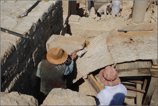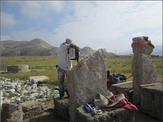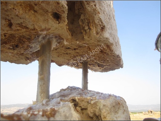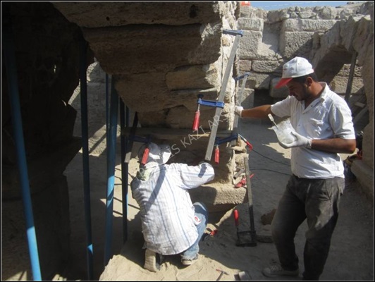 Kemerlerin restorasyon çalışmalarını kolaylaştırmak amacıyla restorasyon yapılacak kemerlerin altlarındaki dolgu toprak kısımları uygun yüksekliklerde kazılmadan bırakılmıştır. Bu dolgu toprak kısımların üzerine kemerlerin kavsine uygun olarak ahşap kalıplar yerleştirilerek tasnif alanına taşınarak restore edilmiş kemer blokları tekrar orijinal yerlerine yerleştirilmiştir (Figür 5). Bloklar arasında boşluk kalan kısımlara kurşun sıkıştırılarak harç ile doldurulmuştur (Figür 6).